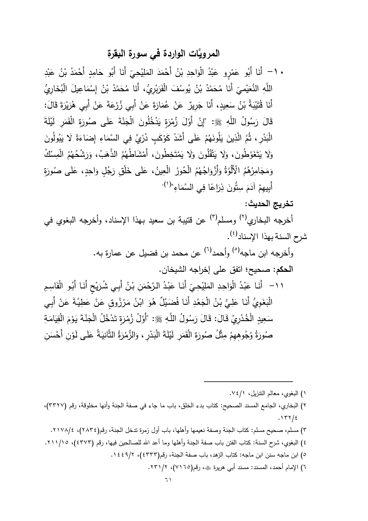 10 - أَنَا أَبُو عَمْرٍو عَبْدُ الْوَاحِدِ بْنُ أَحْمَدَ المَلِيْحِيّ أَنَا أَبُو حَامِدٍ أَحْمَدُ بْنُ عَبْدِ اللَّهِ النُّعَيْميّ أَنَا مُحَمَّدُ بْنُ يُوسُفَ الْفَرَبْرِيُّ، أَنَا مُحَمَّدُ بْنُ إِسْمَاعِيلَ الْبُخَارِيُّ أَنَا قُتَيْبَةُ بْنُ سَعِيدٍ، أَنَا جَرِيرٌ عَنْ عُمَارَةَ عَنْ أَبِي زُرْعَةَ عَنْ أَبِي هُرَيْرَةَ قَالَ: قَالَ رَسُولُ اللَّهِ - صلى الله عليه وسلم -: "إِنَّ أَوَّلَ زُمْرَةٍ يَدْخُلُونَ الْجَنَّةَ عَلَى صُورَةِ الْقَمَرِ لَيْلَةَ الْبَدْرِ، ثُمَّ الَّذِينَ يَلُونَهُمْ عَلَى أَشَدِّ كَوْكَبٍ دُرِّيٍّ فِي السَّمَاءِ إِضَاءَةً لَا يَبُولُونَ وَلَا يَتَغَوَّطُونَ، وَلَا يَتْفُلُونَ وَلَا يَمْتَخِطُونَ، أَمْشَاطُهُمُ الذَّهَبُ، وَرَشْحُهُمُ الْمِسْكُ وَمَجَامِرُهُمُ الْأَلُوَّةُ وَأَزْوَاجُهُمُ الْحُورُ الْعِينُ، عَلَى خَلْقِ رَجُلٍ وَاحِدٍ، عَلَى صُورَةِ أَبِيهِمْ آدَمَ سِتُّونَ ذِرَاعًا فِي السَّمَاءِ" (¬1).