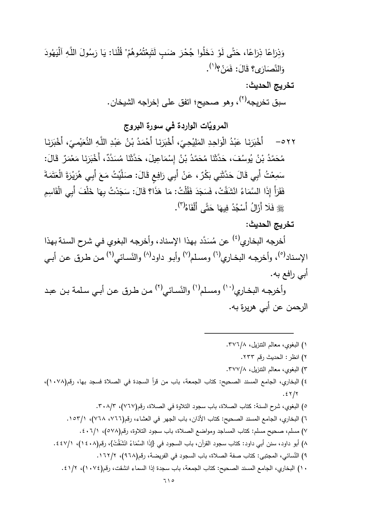 522 - أَخْبَرَنَا عَبْدُ الْوَاحِدِ المَلِيْحِيّ، أَخْبَرَنَا أَحْمَدُ بْنُ عَبْدِ اللَّهِ النُّعَيْميّ، أَخْبَرَنَا مُحَمَّدُ بْنُ يُوسُفَ، حَدَّثَنَا مُحَمَّدُ بْنُ إِسْمَاعِيلَ، حَدَّثَنَا مُسَدَّدٌ، أَخْبَرَنَا مَعْمَرٌ قَالَ: سَمِعْتُ أَبِي قَالَ حَدَّثَنِي بَكْرٌ، عَنْ أَبِي رَافِعٍ قَالَ: صَلَّيْتُ مَعَ أَبِي هُرَيْرَةَ الْعَتَمَةَ فَقَرَأَ إِذَا السَّمَاءُ انْشَقَّتْ، فَسَجَدَ فَقُلْتُ: مَا هَذَا؟ قَالَ: سَجَدْتُ بِهَا خَلْفَ أَبِي الْقَاسِمِ - صلى الله عليه وسلم - فَلَا أَزَالُ أَسْجُدُ فِيهَا حَتَّى أَلْقَاهُ (¬3).