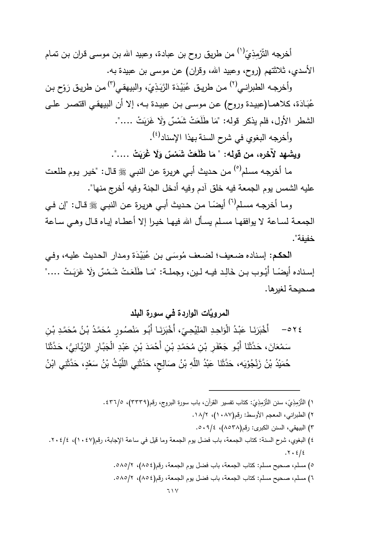 (¬4) البغوي، شرح السنة: كتاب الجمعة، باب فضل يوم الجمعة وما قيل في ساعة الإجابة، رقم (1047)، 4/ 204.