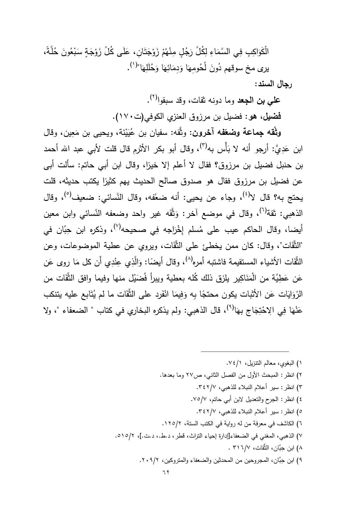 وثّقه جماعة وضعّفه آخرون: وثَّقه: سفيان بن عُيَيْنَة، ويحيى بن مَعِين، وقال ابن عَدِيٍّ: أرجو أنه لا بَأْس به (¬3)، وقال أبو بكر الأثرم قال قلت لأبي عبد الله أحمد بن حنبل فضيل بن مرزوق؟ فقال لا أعلم إلا خيرًا، وقال ابن أبي حاتم: سألت أبى عن فضيل بن مرزوق فقال هو صدوق صالح الحديث يهم كثيرًا يكتب حديثه، قلت يحتج به؟ قال لا (¬4)، وجاء عن يحيى: أنه ضعَّفه، وقال النَّسائي: ضعيف (¬5)، وقال الذهبي: ثقة (¬6)، وقال في موضع آخر: وَثَّقَه غير واحد وضعفه النَّسائي وابن معين أيضا، وقال الحاكم عيب على مُسلم إِخْرَاجه فِي صحيحه (¬7)، وذكره ابن حِبَّان في "الثِّقَات"، وقال: كان ممن يخطئ على الثِّقَات، ويروي عن عطية الموضوعات، وعن الثِّقَات الأشياء المستقيمة فاشتبه أمره (¬8)، وقال أيضًا: وَالَّذِي عِنْدِي أَن كل مَا روى عَن عَطِيَّة من الْمَنَاكِير يلزق ذلك كُله بعطية ويبرأ فُضَيْل منها وفيما وافق الثِّقَات من الرِّوَايَات عَن الأثبات يكون محتجًا بِه وَفِيمَا انْفَرد على الثِّقَات ما لم يُتَابع عليه يتنكب عَنْهَا فِي الِاحْتِجَاج بهَا (¬9)، قال الذهبي: ولم يذكره البخاري في كتاب " الضعفاء "، ولا