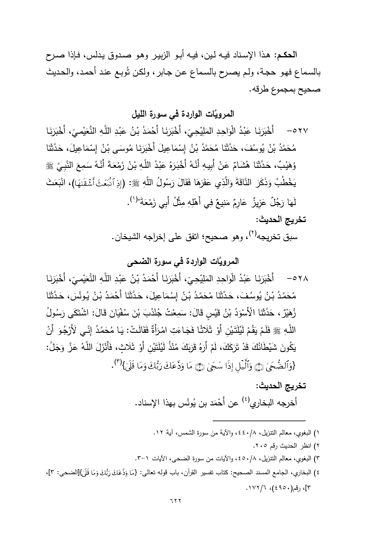 528 - أَخْبَرَنَا عَبْدُ الْوَاحِدِ المَلِيْحِيّ، أَخْبَرَنَا أَحْمَدُ بْنُ عَبْدِ اللَّهِ النُّعَيْميّ، أَخْبَرَنَا مُحَمَّدُ بْنُ يُوسُفَ، حَدَّثَنَا مُحَمَّدُ بْنُ إِسْمَاعِيلَ، حَدَّثَنَا أَحْمَدُ بْنُ يُونُسَ، حَدَّثَنَا زُهَيْرٌ، حَدَّثَنَا الْأَسْوَدُ بْنُ قَيْسٍ قَالَ: سَمِعْتُ جُنْدُبَ بْنَ سُفْيَانَ قَالَ: اشْتَكَى رَسُولُ اللَّهِ - صلى الله عليه وسلم - فَلَمْ يَقُمْ لَيْلَتَيْنِ أَوْ ثَلَاثًا فَجَاءَتِ امْرَأَةٌ فَقَالَتْ: يَا مُحَمَّدُ إِنِّي لَأَرْجُوَ أَنْ يَكُونَ شَيْطَانُكَ قَدْ تَرَكَكَ، لَمْ أَرَهُ قَرَبَكَ مُنْذُ لَيْلَتَيْنِ أَوْ ثَلَاثٍ، فَأَنْزَلَ اللَّهُ عَزَّ وَجَلَّ: {وَالضُّحَى (1) وَاللَّيْلِ إِذَا سَجَى (2) مَا وَدَّعَكَ رَبُّكَ وَمَا قَلَى} (¬3).