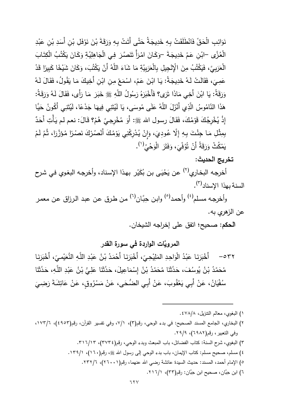 (¬2) البخاري، الجامع المسند الصحيح: في بدء الوحي، رقم (3)، 1/ 7، وفي تفسير القرآن، رقم (4953)، 6/ 173، وفي التعبير، رقم (6982)، 9/ 29.