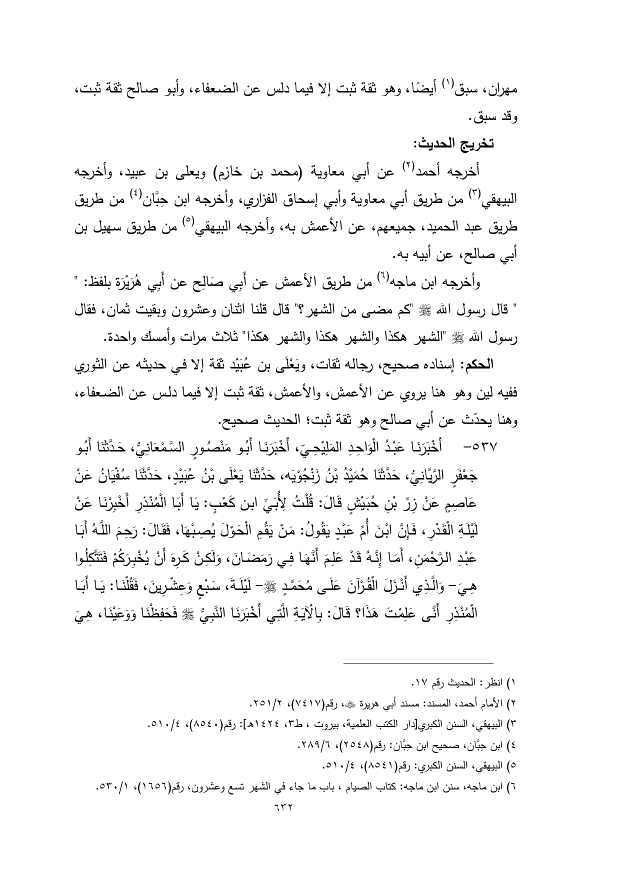 أخرجه أحمد (¬2) عن أبي معاوية (محمد بن خازم) ويعلى بن عبيد، وأخرجه البيهقي (¬3) من طريق أبي معاوية وأبي إسحاق الفزاري، وأخرجه ابن حِبَّان (¬4) من طريق عبد الحميد، جميعهم، عن الأعمش به، وأخرجه البيهقي (¬5) من طريق سهيل بن أبي صالح، عن أبيه به.