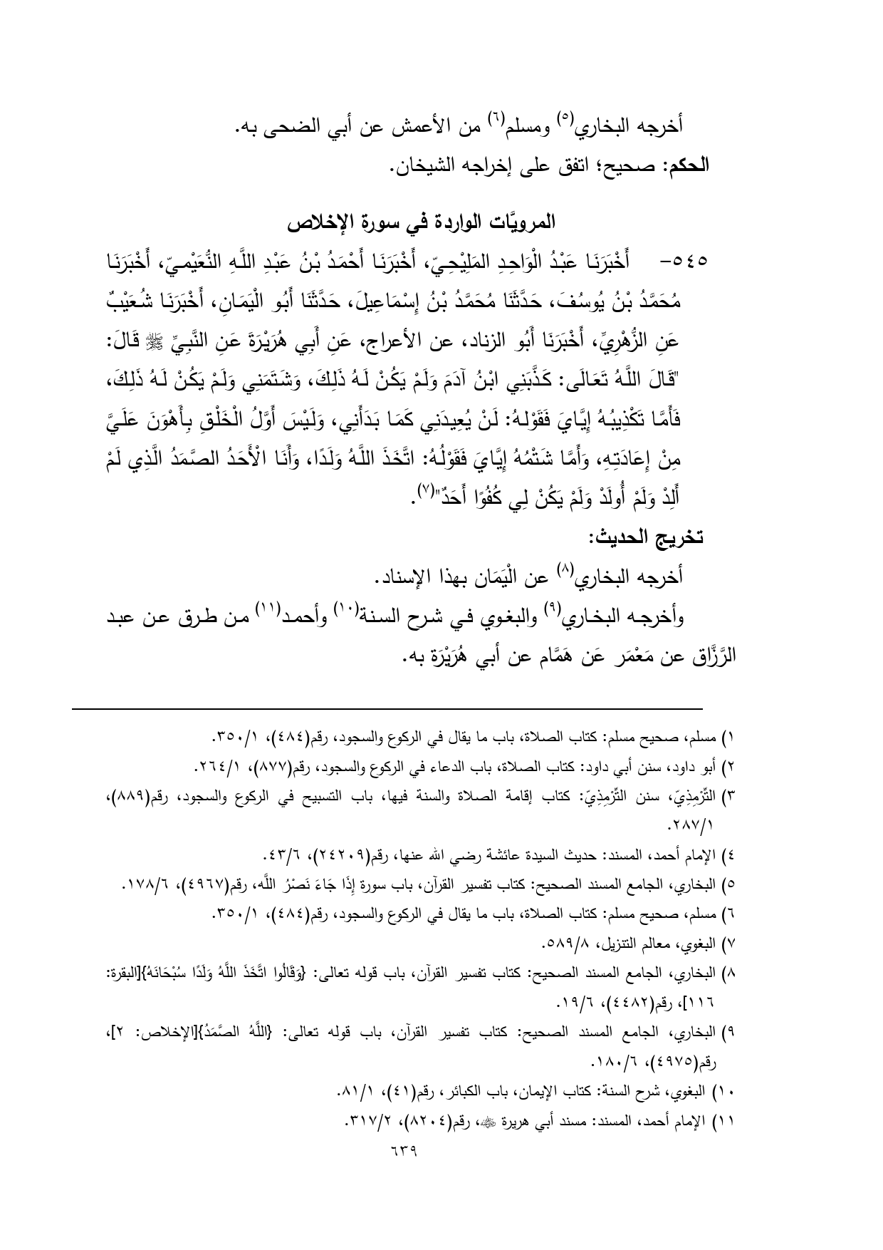 545 - أَخْبَرَنَا عَبْدُ الْوَاحِدِ المَلِيْحِيّ، أَخْبَرَنَا أَحْمَدُ بْنُ عَبْدِ اللَّهِ النُّعَيْميّ، أَخْبَرَنَا مُحَمَّدُ بْنُ يُوسُفَ، حَدَّثَنَا مُحَمَّدُ بْنُ إِسْمَاعِيلَ، حَدَّثَنَا أَبُو الْيَمَانِ، أَخْبَرَنَا شُعَيْبٌ عَنِ الزُّهْرِيِّ، أَخْبَرَنَا أَبُو الزناد، عن الأعراج، عَنِ أَبِي هُرَيْرَةَ عَنِ النَّبِيِّ - صلى الله عليه وسلم - قَالَ: "قَالَ اللَّهُ تَعَالَى: كَذَّبَنِي ابْنُ آدَمَ وَلَمْ يَكُنْ لَهُ ذَلِكَ، وَشَتَمَنِي وَلَمْ يَكُنْ لَهُ ذَلِكَ، فَأَمَّا تَكْذِيبُهُ إِيَّايَ فَقَوْلهُ: لَنْ يُعِيدَنِي كَمَا بَدَأَنِي، وَلَيْسَ أَوَّلُ الْخَلْقِ بِأَهْوَنَ عَلَيَّ مِنْ إِعَادَتِهِ، وَأَمَّا شَتْمُهُ إِيَّايَ فَقَوْلُهُ: اتَّخَذَ اللَّهُ وَلَدًا، وَأَنَا الْأَحَدُ الصَّمَدُ الَّذِي لَمْ أَلِدْ وَلَمْ أُولَدْ وَلَمْ يَكُنْ لِي كُفُوًا أَحَدٌ" (¬3).