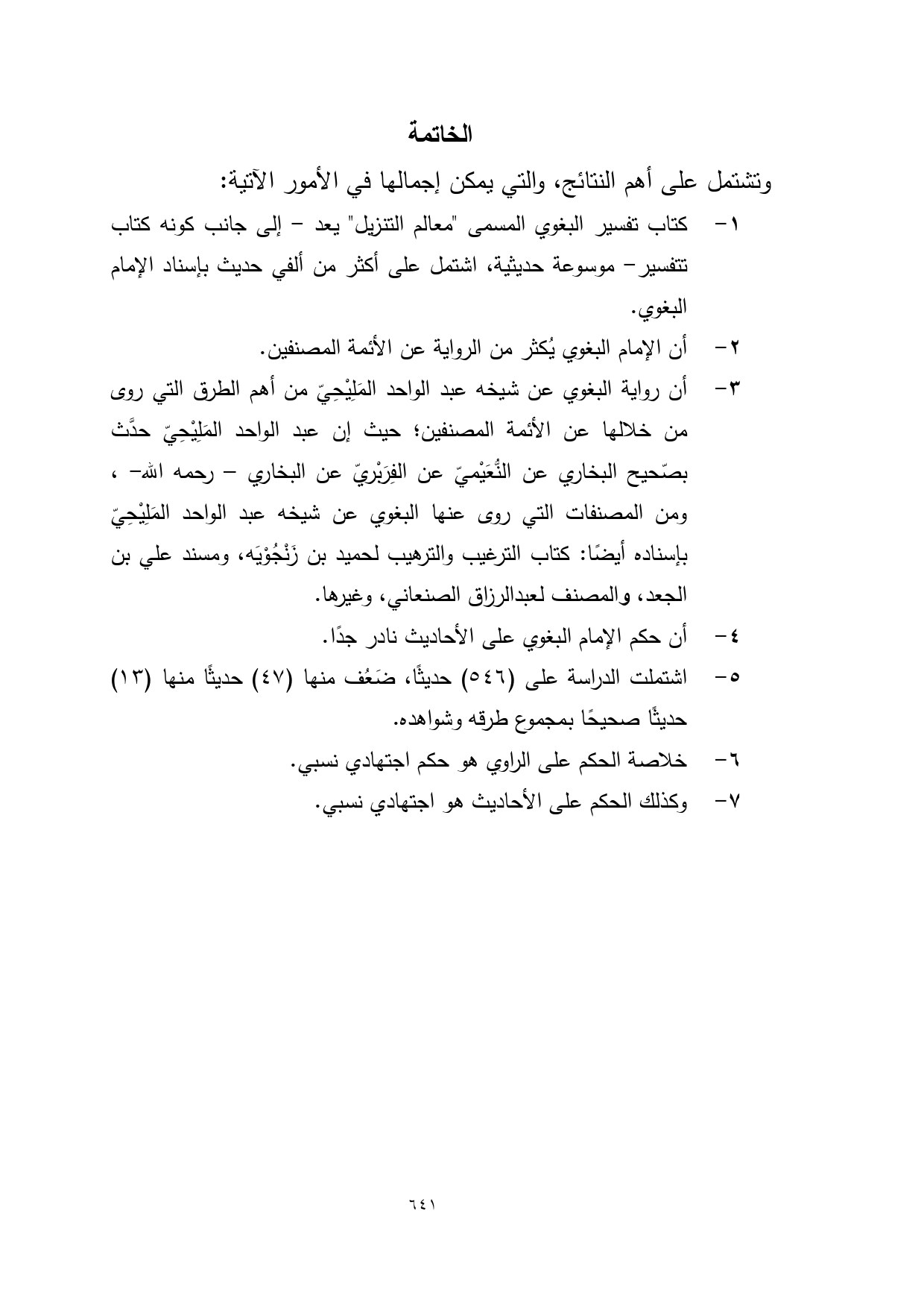 كتاب روايات البغوي في تفسيره معالم التنزيل عن شيخه عبد الواحد المليحي "تخريج ودراسة"