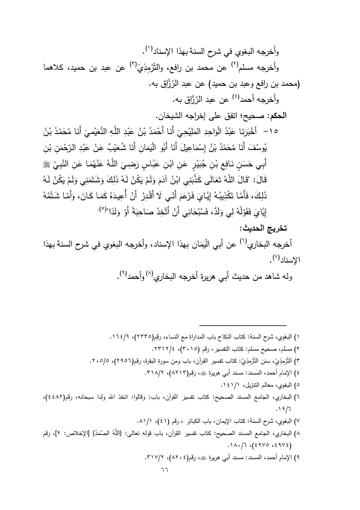 15 - أخْبَرَنَا عَبْدُ الْوَاحِدِ المَلِيْحِيّ أَنَا أَحْمَدُ بْنُ عَبْدِ اللَّهِ النُّعَيْميّ أَنَا مُحَمَّدُ بْنُ يُوسُفَ أَنَا مُحَمَّدُ بْنُ إِسْمَاعِيلَ أَنَا أَبُو الْيَمَانِ أَنَا شُعَيْبٌ عَنْ عَبْدِ الرَّحْمَنِ بْنِ أَبِي حَسَنٍ نَافِعِ بْنِ جُبَيْرٍ عَنِ ابْنِ عَبَّاسٍ رَضِيَ اللَّهُ عَنْهُمَا عَنِ النَّبِيِّ - صلى الله عليه وسلم - قَالَ: "قَالَ اللَّهُ تَعَالَى كَذَّبَنِي ابْنُ آدَمَ وَلَمْ يَكُنْ لَهُ ذَلِكَ وَشَتَمَنِي وَلَمْ يَكُنْ لَهُ ذَلِكَ، فَأَمَّا تَكْذِيبُهُ إِيَّايَ فَزَعَمَ أَنِّي لَا أَقْدِرُ أَنْ أُعِيدَهُ كَمَا كَانَ، وَأَمَّا شَتْمُهُ إِيَّايَ فَقَوْلُهُ لِي وَلَدٌ، فَسُبْحَانِي أَنْ أَتَّخِذَ صَاحِبَةً أَوْ وَلَدًا" (¬5).