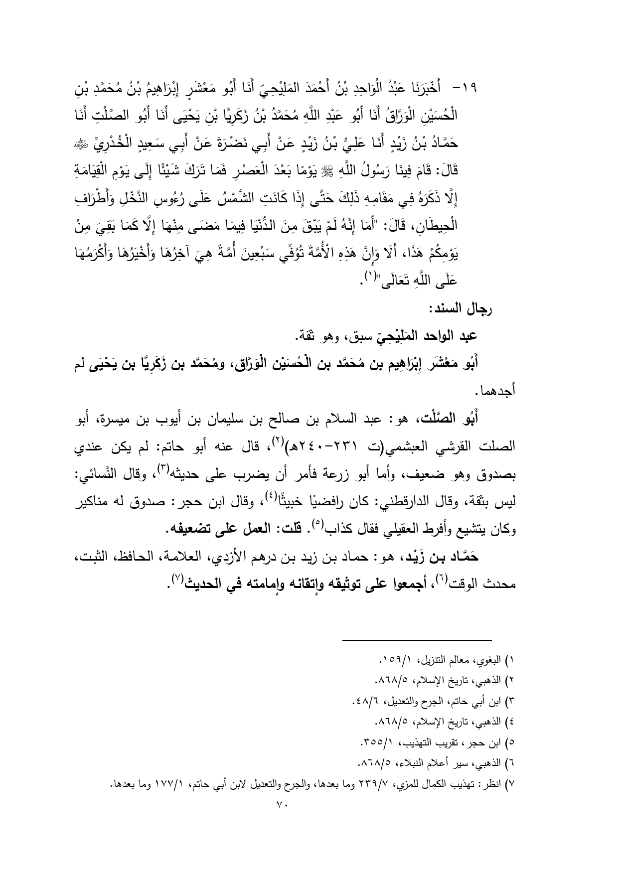 19 - أَخْبَرَنَا عَبْدُ الْوَاحِدِ بْنُ أَحْمَدَ المَلِيْحِيّ أَنَا أَبُو مَعْشَرٍ إِبْرَاهِيمُ بْنُ مُحَمَّدِ بْنِ الْحُسَيْنِ الْوَرَّاقُ أَنَا أَبُو عَبْدِ اللَّهِ مُحَمَّدُ بْنُ زَكَرِيَّا بْنِ يَحْيَى أَنَا أَبُو الصَّلْتِ أَنَا حَمَّادُ بْنُ زَيْدٍ أَنَا عَلِيُّ بْنُ زَيْدٍ عَنْ أَبِي نَضْرَةَ عَنْ أَبِي سَعِيدٍ الْخُدْرِيِّ - رضي الله عنه - قَالَ: قَامَ فِينَا رَسُولُ اللَّهِ - صلى الله عليه وسلم - يَوْمًا بَعْدَ الْعَصْرِ فَمَا تَرَكَ شَيْئًا إِلَى يَوْمِ الْقِيَامَةِ إِلَّا ذَكَرَهُ فِي مَقَامِهِ ذَلِكَ حَتَّى إِذَا كَانَتِ الشَّمْسُ عَلَى رُءُوسِ النَّخْلِ وَأَطْرَافِ الْحِيطَانِ، قَالَ: "أَمَا إِنَّهُ لَمْ يَبْقَ مِنَ الدُّنْيَا فِيمَا مَضَى مِنْهَا إِلَّا كَمَا بَقِيَ مِنْ يَوْمِكُمْ هَذَا، أَلَا وَإِنَّ هَذِهِ الْأُمَّةَ تُوُفِّي سَبْعِينَ أُمَّةً هِيَ آخِرُهَا وَأَخْيَرُهَا وَأَكْرَمُهَا عَلَى اللَّهِ تَعَالَى" (¬1).