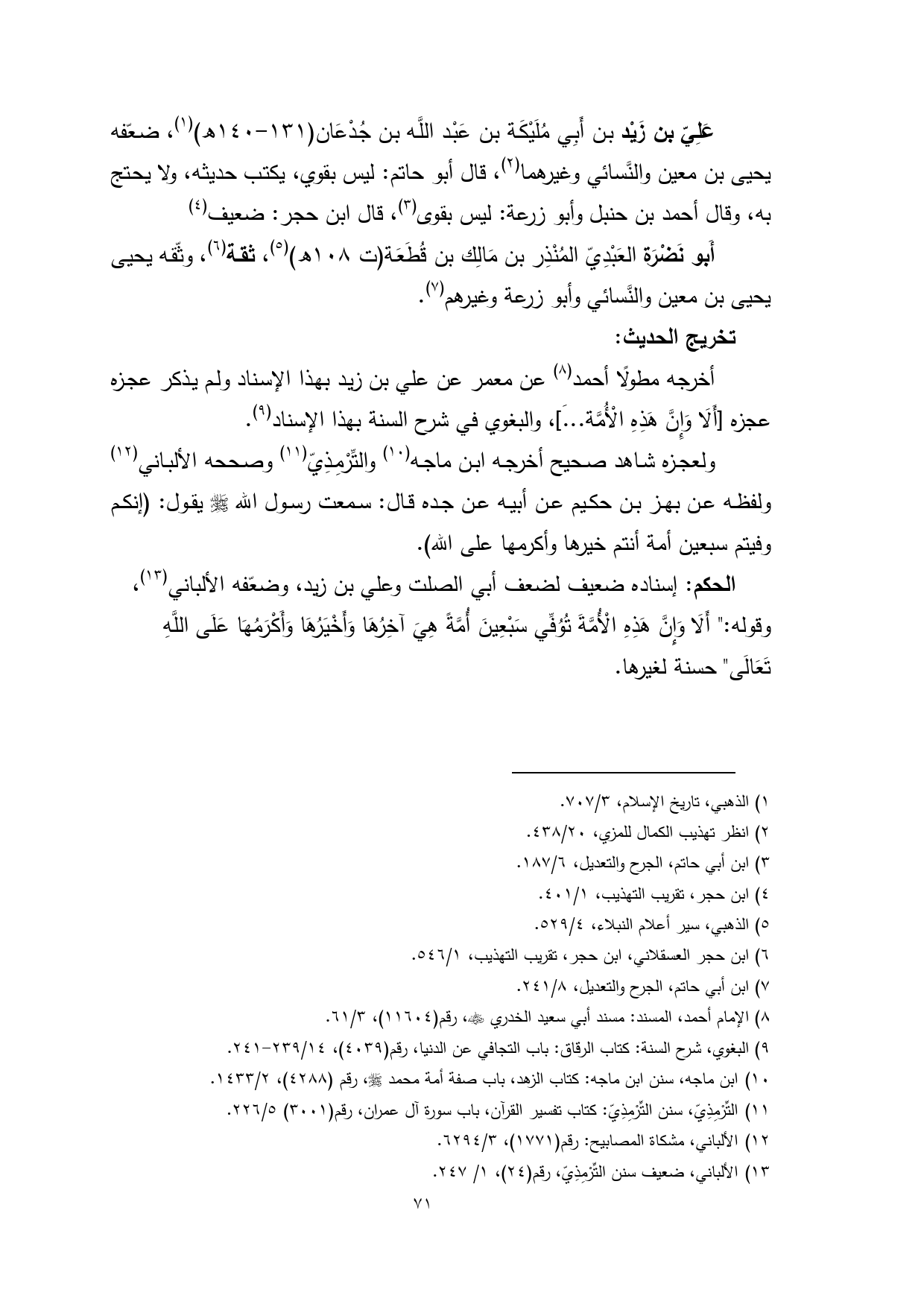الحكم: إسناده ضعيف لضعف أبي الصلت وعلي بن زيد، وضعّفه الألباني (¬13)، وقوله: " أَلَا وَإِنَّ هَذِهِ الْأُمَّةَ تُوُفِّي سَبْعِينَ أُمَّةً هِيَ آخِرُهَا وَأَخْيَرُهَا وَأَكْرَمُهَا عَلَى اللَّهِ تَعَالَى" حسنة لغيرها.