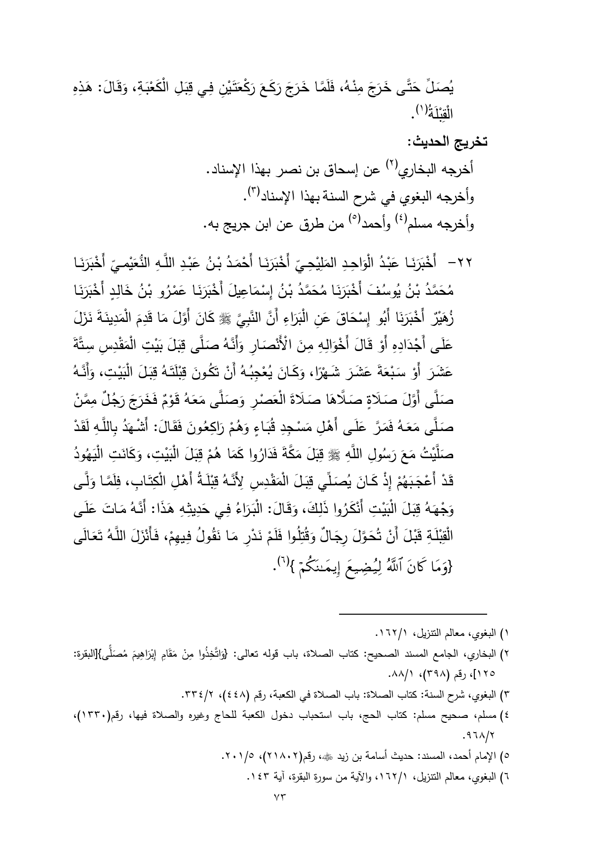 22 - أَخْبَرَنَا عَبْدُ الْوَاحِدِ المَلِيْحِيّ أَخْبَرَنَا أَحْمَدُ بْنُ عَبْدِ اللَّهِ النُّعَيْميّ أَخْبَرَنَا مُحَمَّدُ بْنُ يُوسُفَ أَخْبَرَنَا مُحَمَّدُ بْنُ إِسْمَاعِيلَ أَخْبَرَنَا عَمْرُو بْنُ خَالِدٍ أَخْبَرَنَا زُهَيْرٌ أَخْبَرَنَا أَبُو إِسْحَاقَ عَنِ الْبَرَاءِ أَنَّ النَّبِيَّ - صلى الله عليه وسلم - كَانَ أَوَّلَ مَا قَدِمَ الْمَدِينَةَ نَزَلَ عَلَى أَجْدَادِهِ أَوْ قَالَ أَخْوَالِهِ مِنَ الْأَنْصَارِ وَأَنَّهُ صَلَّى قِبَلَ بَيْتِ الْمَقْدِسِ سِتَّةَ عَشَرَ أَوْ سَبْعَةَ عَشَرَ شَهْرًا، وَكَانَ يُعْجِبُهُ أَنْ تَكُونَ قِبْلَتَهُ قِبَلَ الْبَيْتِ، وَأَنَّهُ صَلَّى أَوَّلَ صَلَاةٍ صَلَّاهَا صَلَاةَ الْعَصْرِ وَصَلَّى مَعَهُ قَوْمٌ فَخَرَجَ رَجُلٌ مِمَّنْ صَلَّى مَعَهُ فَمَرَّ عَلَى أَهْلِ مَسْجِدِ قُبَاءٍ وَهُمْ رَاكِعُونَ فَقَالَ: أَشْهَدُ بِاللَّهِ لَقَدْ صَلَّيْتُ مَعَ رَسُولِ اللَّهِ - صلى الله عليه وسلم - قِبَلَ مَكَّةَ فَدَارُوا كَمَا هُمْ قِبَلَ الْبَيْتِ، وَكَانَتِ الْيَهُودُ قَدْ أَعْجَبَهُمْ إِذْ كَانَ يُصَلِّي قِبَلَ الْمَقْدِسِ لِأَنَّهُ قِبْلَةُ أَهْلِ الْكِتَابِ، فِلَمَّا وَلَّى وَجْهَهُ قِبَلَ الْبَيْتِ أَنْكَرُوا ذَلِكَ، وَقَالَ: الْبَرَاءُ فِي حَدِيثِهِ هَذَا: أَنَّهُ مَاتَ عَلَى الْقِبْلَةِ قَبْلَ أَنْ تُحَوَّلَ رِجَالٌ وَقُتِلُوا فَلَمْ نَدْرِ مَا نَقُولُ فِيهِمْ، فَأَنْزَلَ اللَّهُ تَعَالَى {وَمَا كَانَ اللَّهُ لِيُضِيعَ إِيمَانَكُمْ} (¬6).