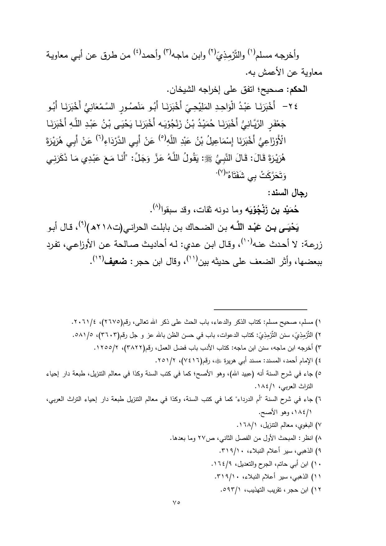 24 - أَخْبَرَنَا عَبْدُ الْوَاحِدِ المَلِيْحِيّ أَخْبَرَنَا أَبُو مَنْصُورٍ السَّمْعَانِيُّ أَخْبَرَنَا أَبُو جَعْفَرٍ الرَّيَّانِيُّ أَخْبَرَنَا حُمَيْدُ بْنُ زَنْجُوْيَه أَخْبَرَنَا يَحْيَى بْنُ عَبْدِ اللَّهِ أَخْبَرَنَا الْأَوْزَاعِيُّ أَخْبَرَنَا إِسْمَاعِيلُ بْنُ عَبْدِ اللَّهِ (¬5) عَنْ أَبِي الدَّرْدَاءِ (¬6) عَنْ أَبِي هُرَيْرَةَ قَالَ: قَالَ النَّبِيُّ - صلى الله عليه وسلم -: يَقُولُ اللَّهُ عَزَّ وَجَلَّ: "أَنَا مَعَ عَبْدِي مَا ذَكَرَنِي وَتَحَرَّكَتْ بِي شَفَتَاهُ" (¬7).