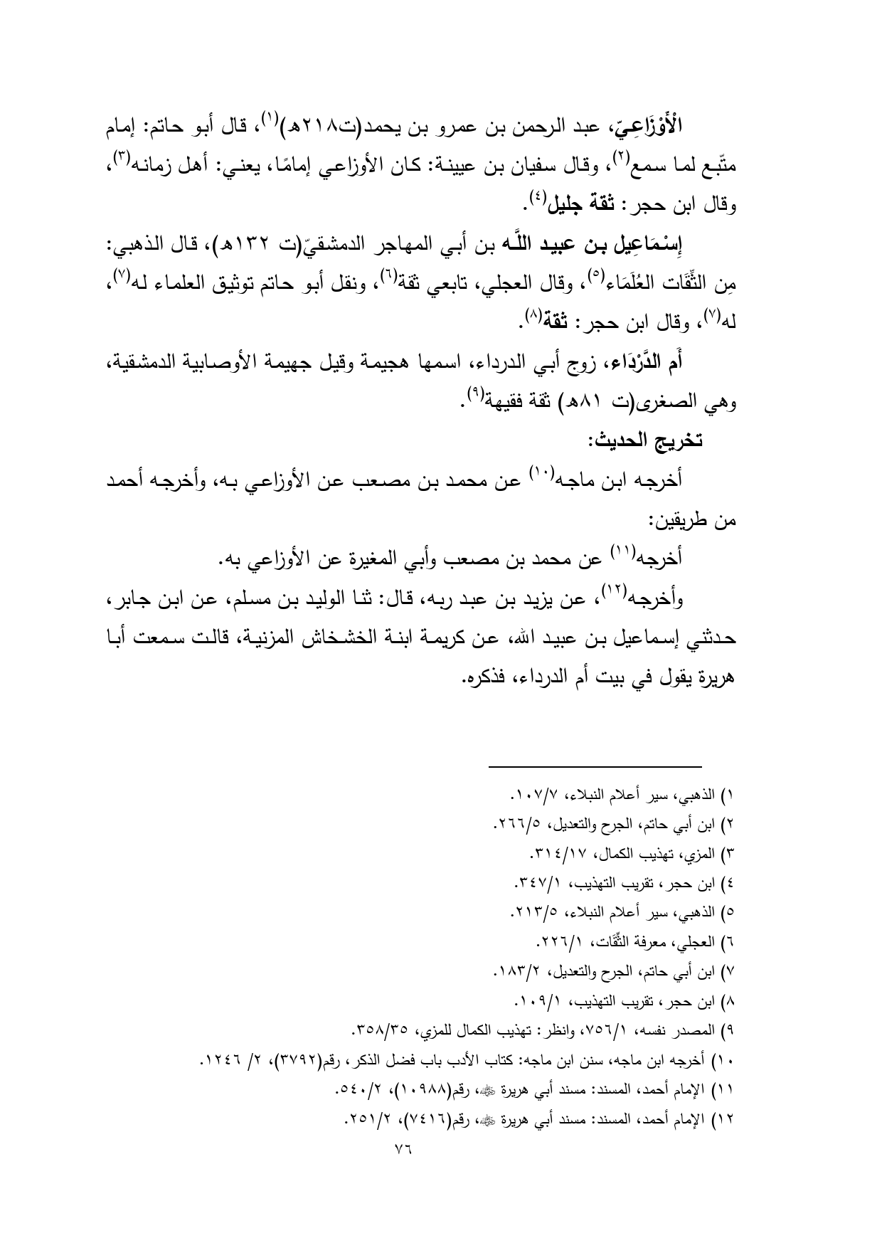 الْأَوْزَاعِيّ، عبد الرحمن بن عمرو بن يحمد (ت 218 هـ) (¬1)، قال أبو حاتم: إمام متّبع لما سمع (¬2)، وقال سفيان بن عيينة: كان الأوزاعي إمامًا، يعني: أهل زمانه (¬3)، وقال ابن حجر: ثقة جليل (¬4).