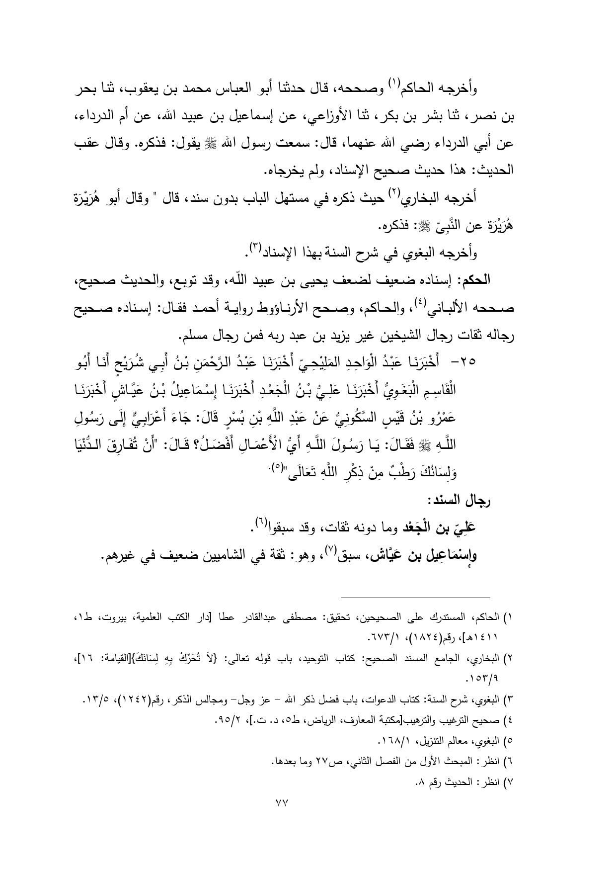 25 - أَخْبَرَنَا عَبْدُ الْوَاحِدِ المَلِيْحِيّ أَخْبَرَنَا عَبْدُ الرَّحْمَنِ بْنُ أَبِي شُرَيْحٍ أَنَا أَبُو الْقَاسِمِ الْبَغَوِيُّ أَخْبَرَنَا عَلِيُّ بْنُ الْجَعْدِ أَخْبَرَنَا إِسْمَاعِيلُ بْنُ عَيَّاشٍ أَخْبَرَنَا عَمْرُو بْنُ قَيْسٍ السَّكُونِيُّ عَنْ عَبْدِ اللَّهِ بْنِ بُسْرٍ قَالَ: جَاءَ أَعْرَابِيٌّ إِلَى رَسُولِ اللَّهِ - صلى الله عليه وسلم - فَقَالَ: يَا رَسُولَ اللَّهِ أَيُّ الْأَعْمَالِ أَفْضَلُ؟ قَالَ: "أَنْ تُفَارِقَ الدُّنْيَا وَلِسَانُكَ رَطْبٌ مِنْ ذِكْرِ اللَّهِ تَعَالَى" (¬5).
