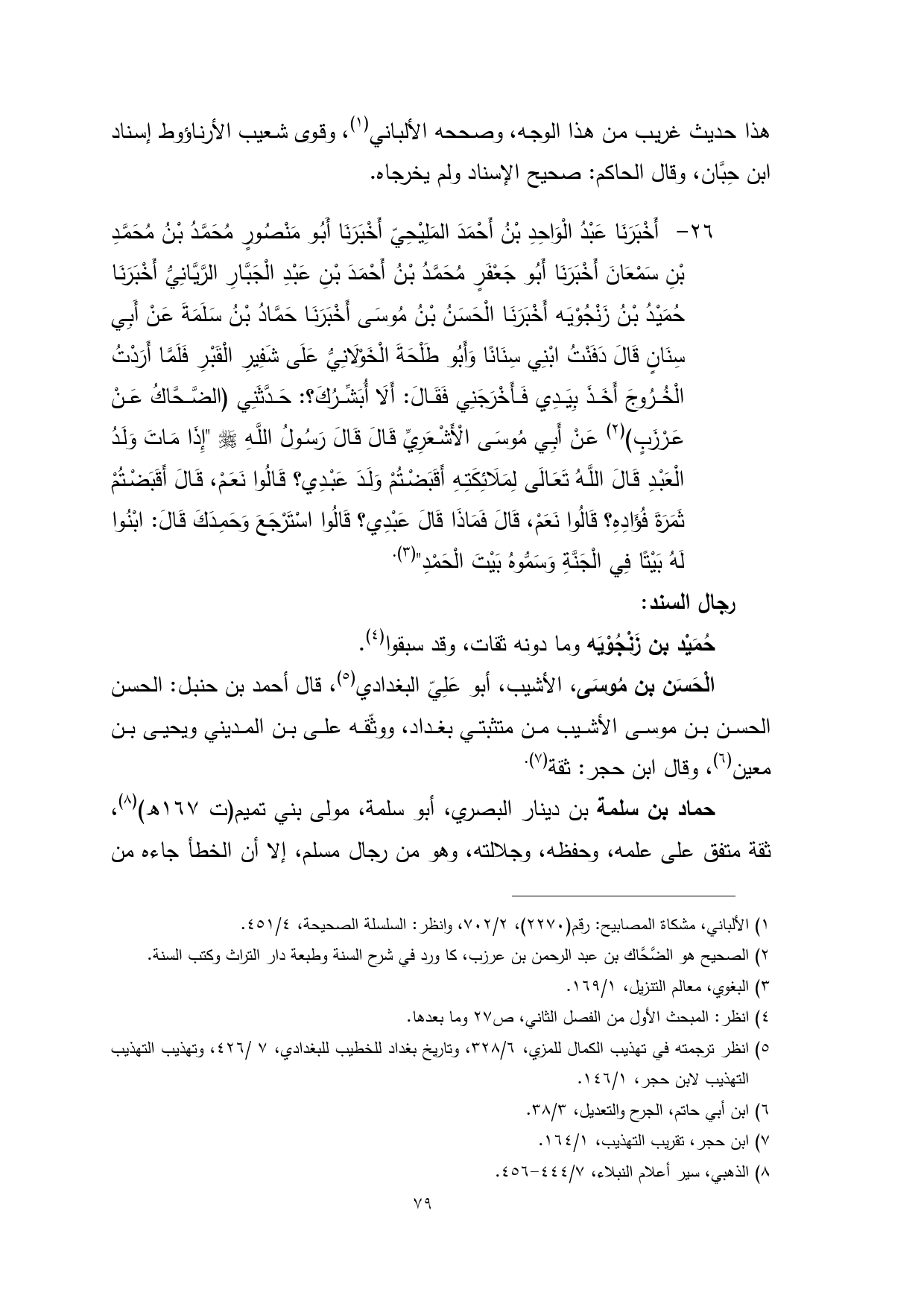 26 - أَخْبَرَنَا عَبْدُ الْوَاحِدِ بْنُ أَحْمَدَ المَلِيْحِيّ أَخْبَرَنَا أَبُو مَنْصُورٍ مُحَمَّدُ بْنُ مُحَمَّدِ بْنِ سَمْعَانَ أَخْبَرَنَا أَبُو جَعْفَرٍ مُحَمَّدُ بْنُ أَحْمَدَ بْنِ عَبْدِ الْجَبَّارِ الرَّيَّانِيُّ أَخْبَرَنَا حُمَيْدُ بْنُ زَنْجُوْيَه أَخْبَرَنَا الْحَسَنُ بْنُ مُوسَى أَخْبَرَنَا حَمَّادُ بْنُ سَلَمَةَ عَنْ أَبِي سِنَانٍ قَالَ دَفَنْتُ ابْنِي سِنَانًا وَأَبُو طَلْحَةَ الْخَوْلَانِيُّ عَلَى شَفِيرِ الْقَبْرِ فَلَمَّا أَرَدْتُ الْخُرُوجَ أَخَذَ بِيَدِي فَأَخْرَجَنِي فَقَالَ: أَلَا أُبَشِّرُكَ؟ : حَدَّثَنِي (الضَّحَّاكُ عَنْ عَرْزَبٍ) (¬2) عَنْ أَبِي مُوسَى الْأَشْعَرِيِّ قَالَ قَالَ رَسُولُ اللَّهِ - صلى الله عليه وسلم - "إِذَا مَاتَ وَلَدُ الْعَبْدِ قَالَ اللَّهُ تَعَالَى لِمَلَائِكَتِهِ أَقَبَضْتُمْ وَلَدَ عَبْدِي؟ قَالُوا نَعَمْ، قَالَ أَقَبَضْتُمْ ثَمَرَةَ فُؤَادِهِ؟ قَالُوا نَعَمْ، قَالَ فَمَاذَا قَالَ عَبْدِي؟ قَالُوا اسْتَرْجَعَ وَحَمِدَكَ قَالَ: ابْنُوا لَهُ بَيْتًا فِي الْجَنَّةِ وَسَمُّوهُ بَيْتَ الْحَمْدِ" (¬3).