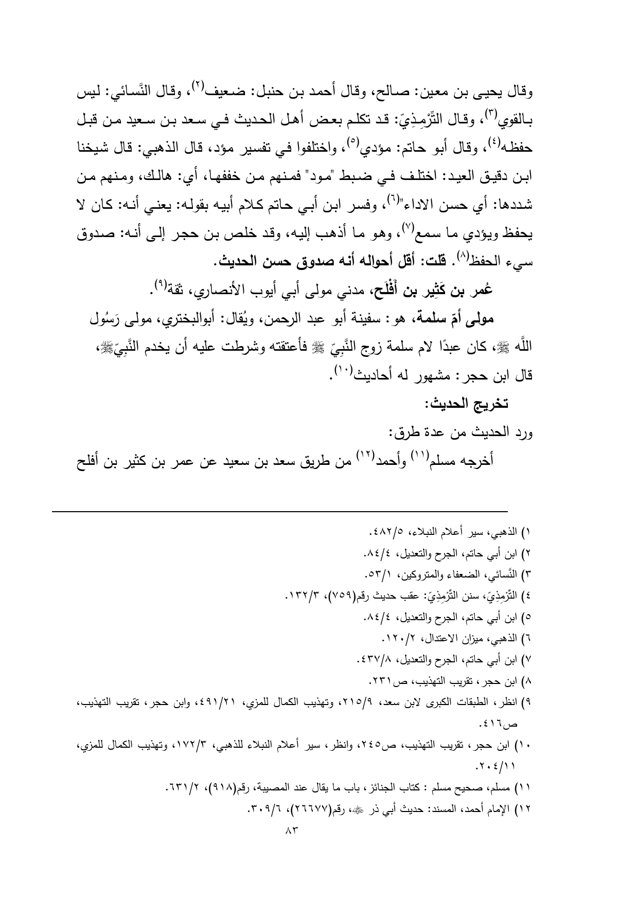 أخرجه مسلم (¬10) وأحمد (¬11) من طريق سعد بن سعيد عن عمر بن كثير بن أفلح