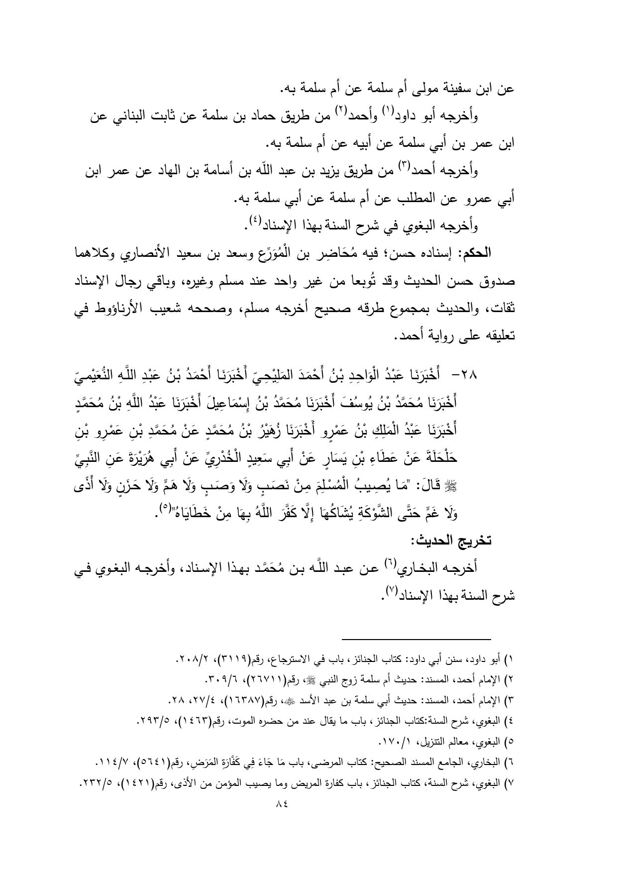 (¬7) البغوي، شرح السنة، كتاب الجنائز، باب كفارة المريض وما يصيب المؤمن من الأذى، رقم (1421)، 5/ 232.