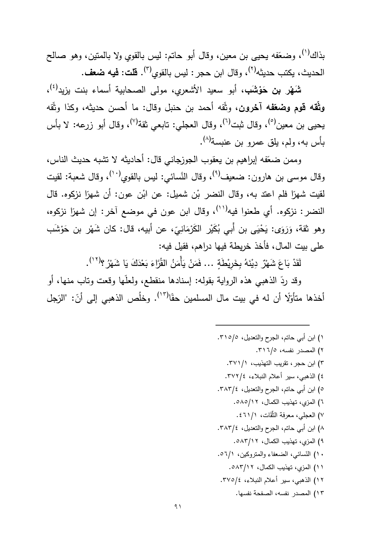 وممن ضعّفه إبراهيم بن يعقوب الجوزجاني قال: أحاديثه لا تشبه حديث الناس، وقال موسى بن هارون: ضعيف (¬9)، وقال النَّسائي: ليس بالقوي (¬10)، وقال شعبة: لقيت شهرًا فلم اعتد به، وقال النضر بْن شميل: عن ابْن عون: أن شهرًا نزكوه. قال النضر: نزكوه. أي طعنوا فيه (¬11)، وقال ابن عون في موضع آخر: إن شهرًا نزكوه، وهو ثقة، وَرَوَى: يَحْيَى بن أَبي بُكَيْر الكَرْمَانِيّ، عن أبيه، قال: كان شَهْر بن حَوْشَب على بيت المال، فأخذ خريطة فيها دراهم، فقيل فيه: