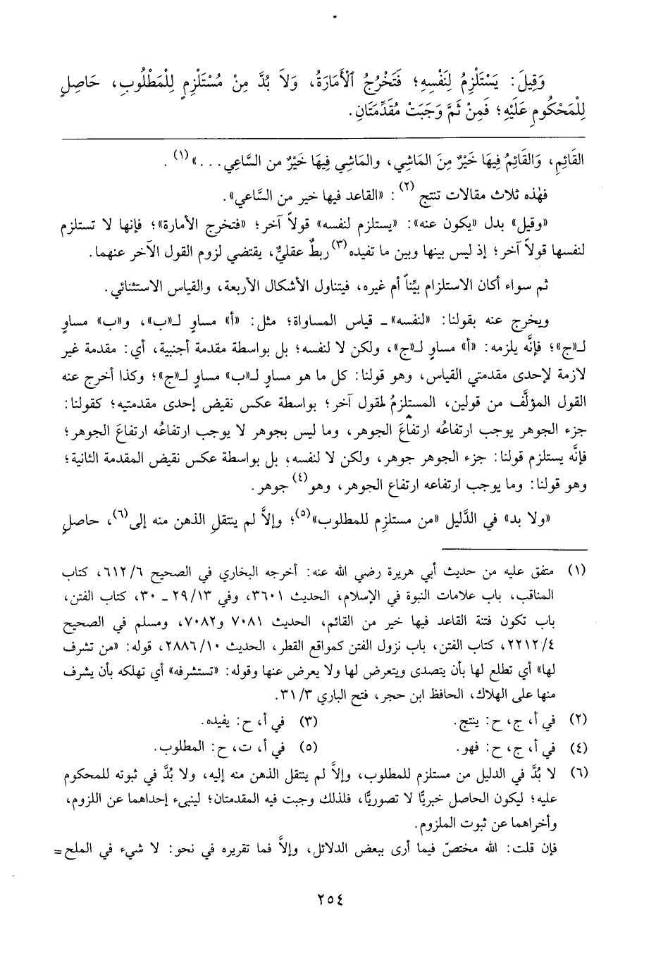 وَقيل: يسْتَلْزم لنَفسِهِ؛ فَتخرج الأمارة، وَلَا بُد من مُسْتَلْزم للمطلوب، حَاصِل للمحكوم عَلَيْهِ؛ فَمن ثمَّ وَجَبت مقدمتان.