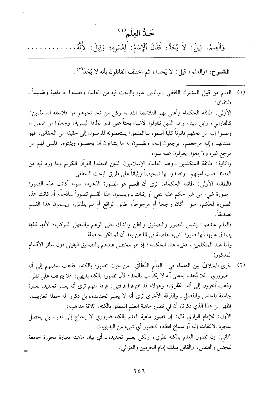" الشَّرْح: " وَالْعلم، قيل: لَا يحد "، ثمَّ اخْتلف الْقَائِلُونَ بِأَنَّهُ لَا يحد: