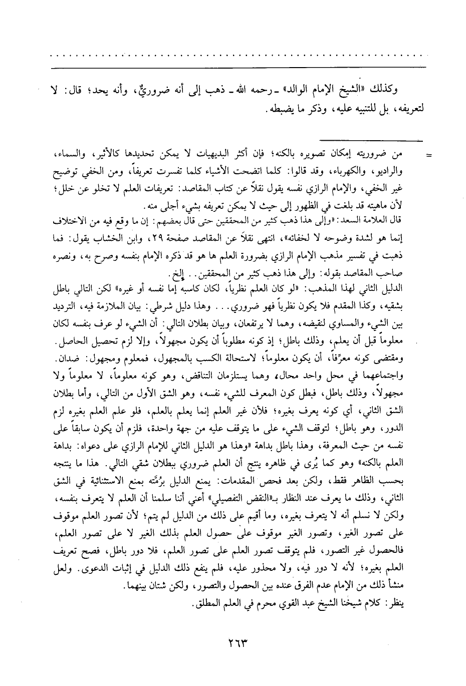 وَكَذَلِكَ " الشَّيْخ الإِمَام الْوَالِد " - رَحمَه الله - ذهب إِلَى أَنه ضَرُورِيّ، وَأَنه يحد؛ قَالَ: لَا لتعريفه، بل للتّنْبِيه عَلَيْهِ، وَذكر مَا يضبطه.