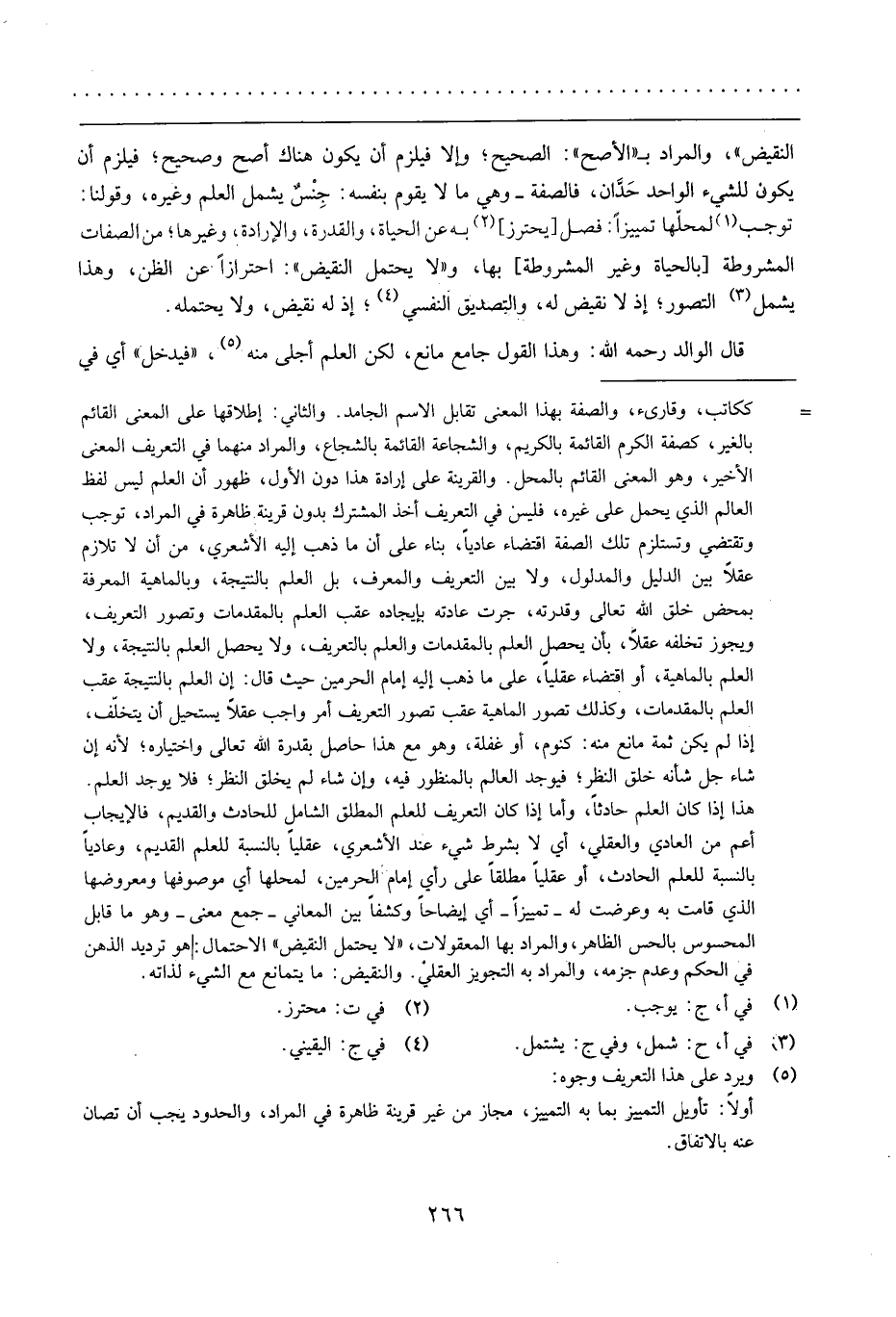 هَامِش النقيض "، وَالْمرَاد ب " الْأَصَح ": الصَّحِيح؛ وَإِلَّا فَيلْزم أَن يكون هُنَاكَ أصح وصحيح؛ فَيلْزم أَن يكون للشَّيْء الْوَاحِد حدان، فالصفة - وَهِي مَا لَا يقوم بِنَفسِهِ: جنس يَشْمَل الْعلم وَغَيره، وَقَوْلنَا: توجب لمحلها تمييزا: فصل [يحْتَرز] بِهِ عَن الْحَيَاة، وَالْقُدْرَة، والإرادة، وَغَيرهَا؛ من الصِّفَات الْمَشْرُوطَة [بِالْحَيَاةِ وَغير الْمَشْرُوطَة] بهَا، و " لَا يحْتَمل النقيض ": احْتِرَازًا عَن الظَّن، وَهَذَا يَشْمَل التَّصَوُّر؛ إِذْ لَا نقيض لَهُ، والتصديق النَّفْسِيّ؛ إِذْ لَهُ نقيض، وَلَا يحْتَملهُ.