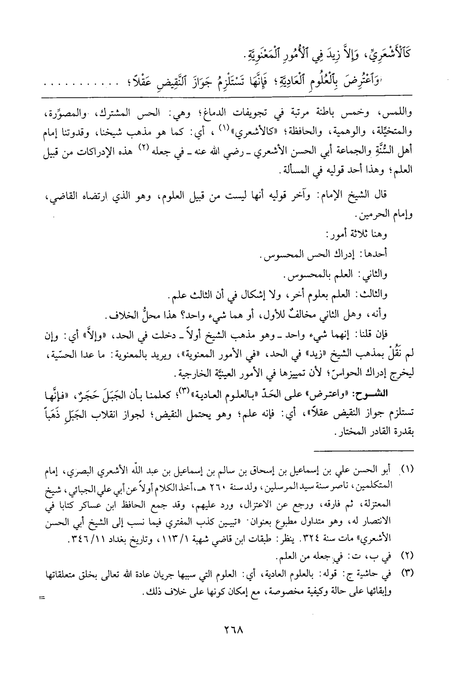 الشَّرْح: " وَاعْترض " على الْحَد " بالعلوم العادية "؛ كعلمنا بِأَن الْجَبَل حجر، " فَإِنَّهَا تَسْتَلْزِم جَوَاز النقيض عقلا "، أَي: فَإِنَّهُ علم؛ وَهُوَ يحْتَمل النقيض؛ لجَوَاز انقلاب الْجَبَل ذَهَبا بقدرة الْقَادِر الْمُخْتَار.