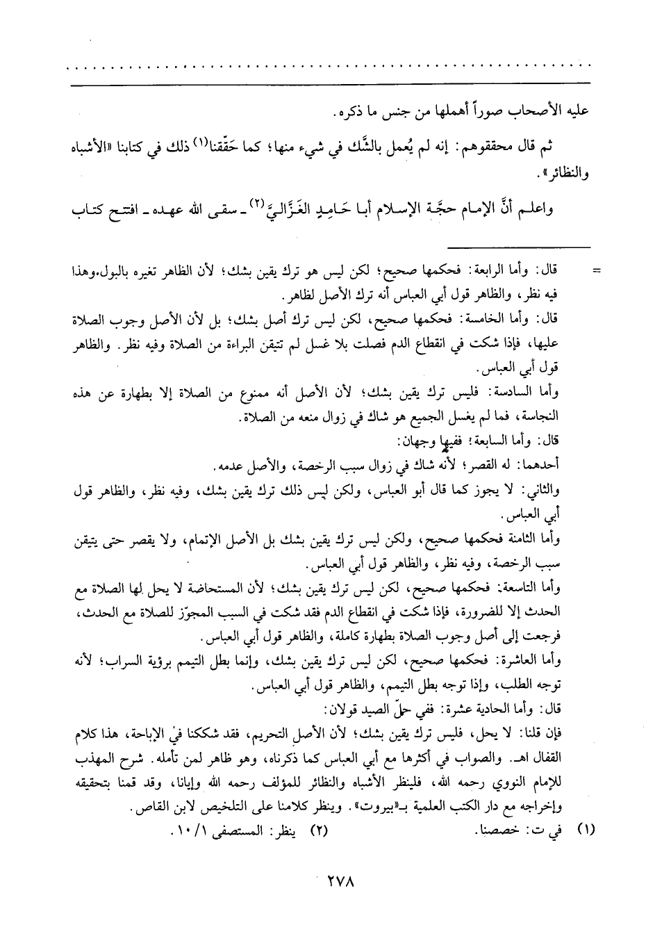 ثمَّ قَالَ محققوهم: إِنَّه لم يعْمل بِالشَّكِّ فِي شَيْء مِنْهَا؛ كَمَا حققنا ذَلِك فِي كتَابنَا " الْأَشْبَاه والنظائر ".