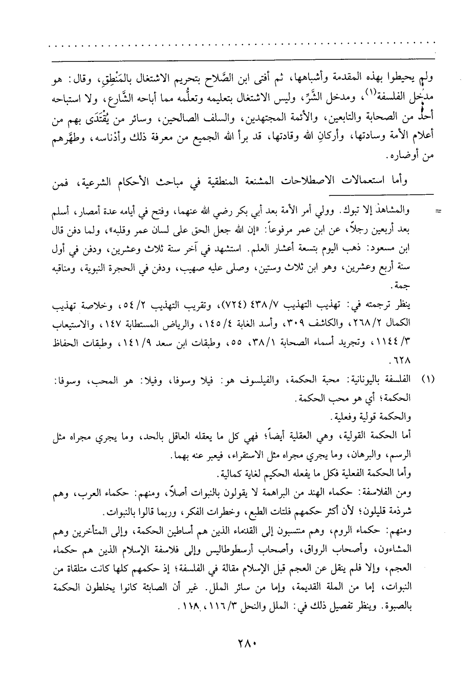 هَامِش وَلم يحيطوا بِهَذِهِ الْمُقدمَة وأشباهها، ثمَّ أفتى ابْن الصّلاح بِتَحْرِيم الِاشْتِغَال بالْمَنْطق وَقَالَ: هُوَ مدْخل الفلسفة، ومدخل الشَّرّ، وَلَيْسَ الِاشْتِغَال بتعليمه وتعلمه مِمَّا أَبَاحَهُ الشَّارِع، وَلَا استباحه أحد من الصَّحَابَة وَالتَّابِعِينَ، وَالْأَئِمَّة الْمُجْتَهدين، وَالسَّلَف الصَّالِحين، وَسَائِر من يقْتَدى بهم من أَعْلَام الْأمة وسادتها، وأركان الله وقادتها، قد برأَ الله الْجَمِيع من معرفَة ذَلِك وأدناسه، وطهرهم من أوضاره.