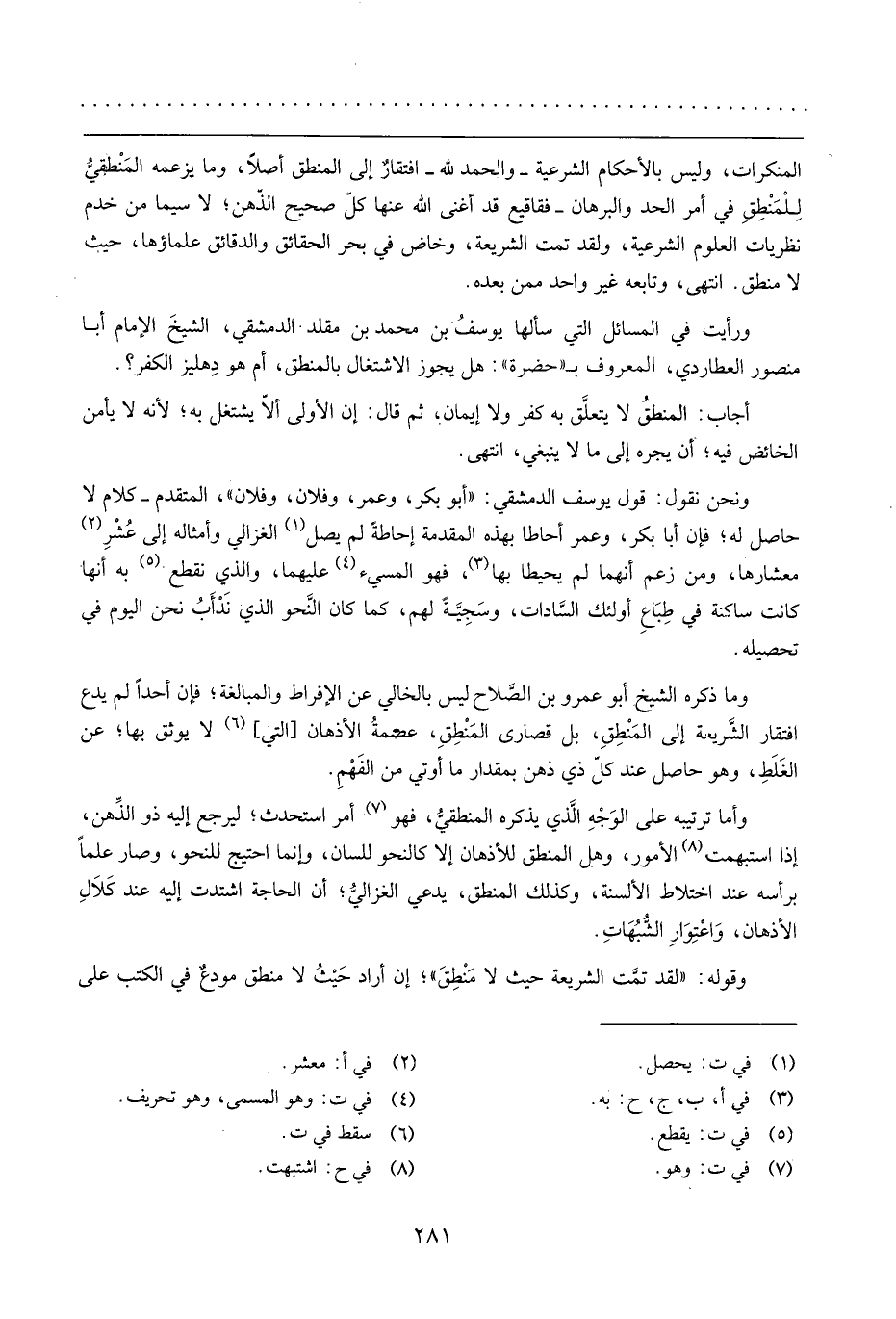 هَامِش الْمُنْكَرَات، وَلَيْسَ بِالْأَحْكَامِ الشَّرْعِيَّة - وَالْحَمْد لله - افتقار إِلَى الْمنطق أصلا، وَمَا يزعمه المنطقي للمنطق فِي أَمر الْحَد والبرهان - فقاقيع قد أغْنى الله عَنْهَا كل صَحِيح الذِّهْن؛ لَا سِيمَا من خدم نظريات الْعُلُوم الشَّرْعِيَّة، وَلَقَد تمت الشَّرِيعَة، وخاض فِي بَحر الْحَقَائِق والدقائق علماؤها، حَيْثُ لَا منطق. انْتهى، وَتَابعه غير وَاحِد مِمَّن بعده.