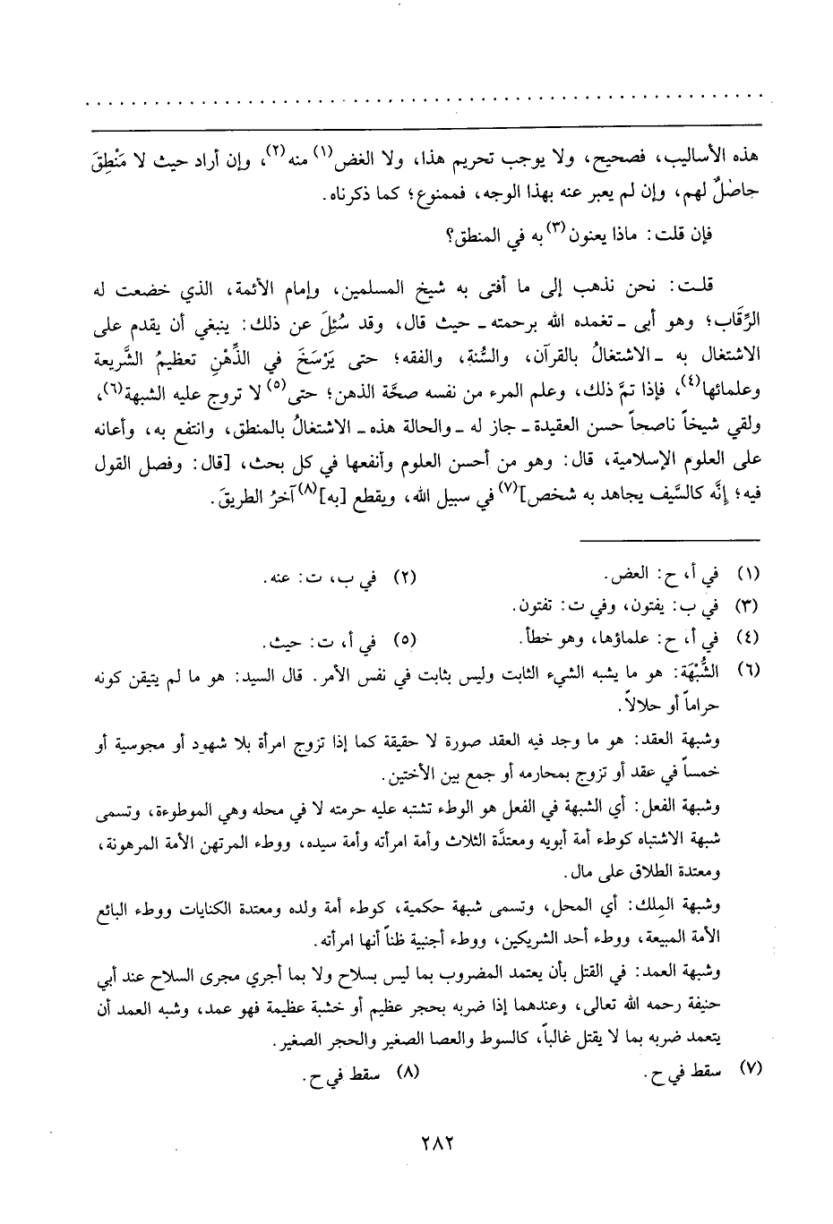 هَامِش هَذِه الأساليب، فَصَحِيح، وَلَا يُوجب تَحْرِيم هَذَا، وَلَا الغض مِنْهُ، وَإِن أَرَادَ حَيْثُ لَا منطق حَاصِل لَهُم، وَإِن لم يعبر عَنهُ بِهَذَا الْوَجْه، فَمَمْنُوع؛ كَمَا ذَكرْنَاهُ.