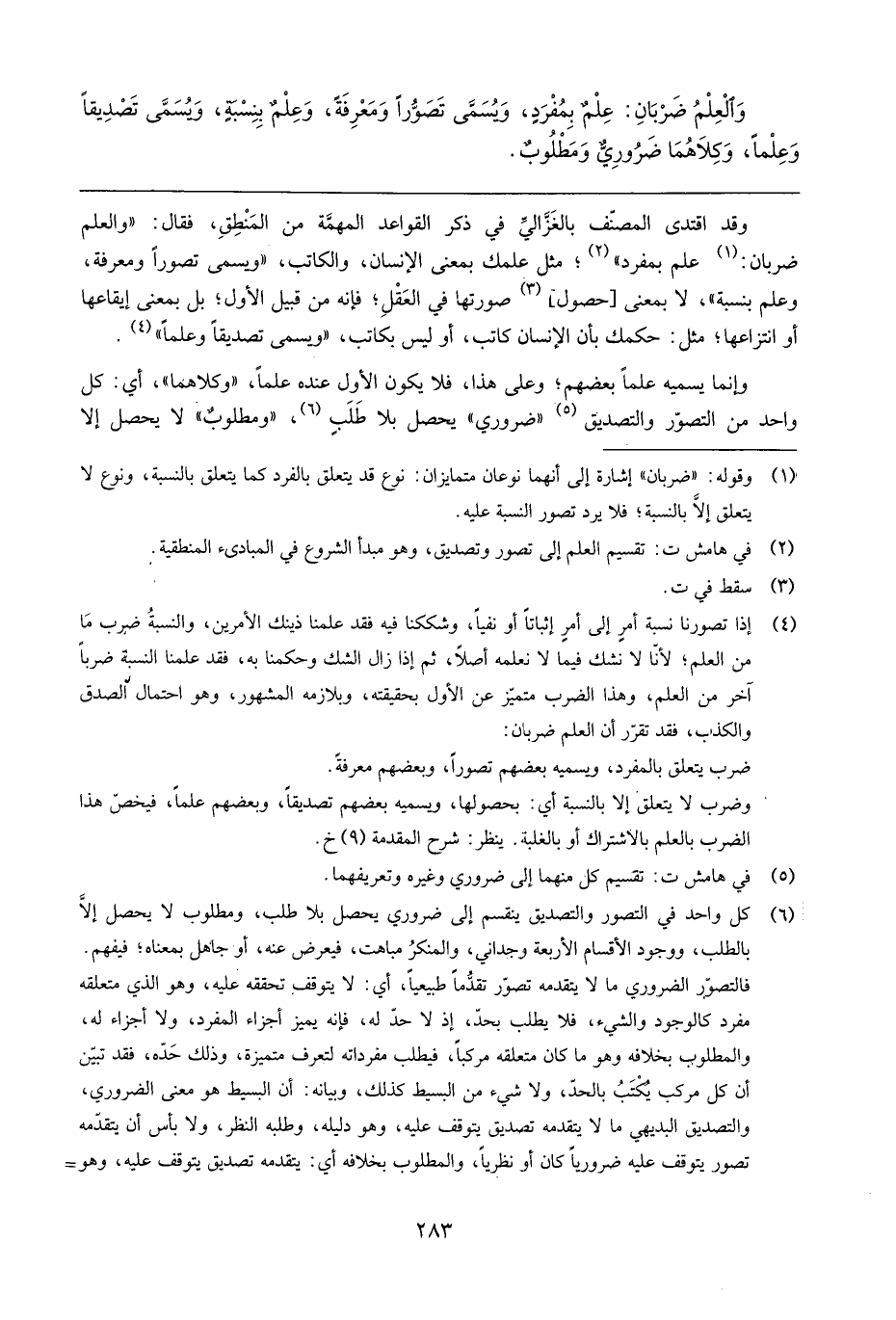 وَالْعلم ضَرْبَان: علم بمفرد، وَيُسمى تصورا وَمَعْرِفَة وَعلم بِنِسْبَة، وَيُسمى تَصْدِيقًا وعلما، وَكِلَاهُمَا ضَرُورِيّ ومطلوب.