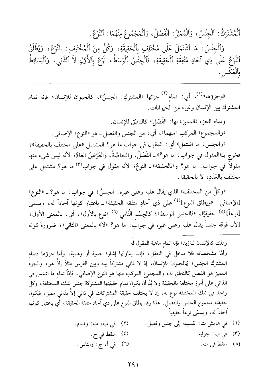 الْمُشْتَرك: الْجِنْس، والمميز: الْفَصْل، وَالْمَجْمُوع مِنْهُمَا: النَّوْع.