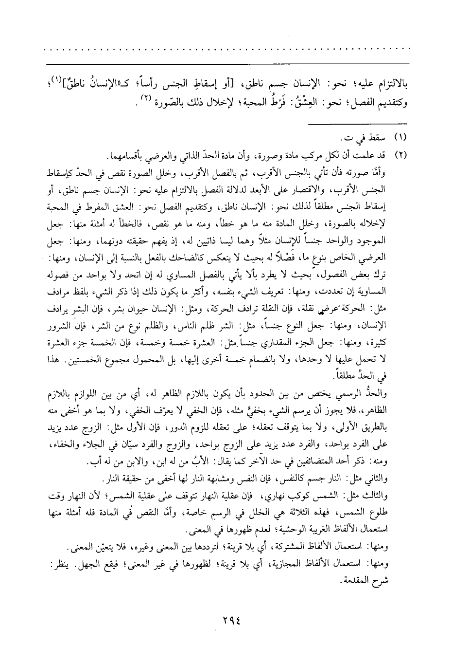 هَامِش بالالتزام عَلَيْهِ؛ نَحْو: الْإِنْسَان جسم نَاطِق، [أَو إِسْقَاط الْجِنْس رَأْسا؛ ك " الْإِنْسَان نَاطِق] ؛ وكتقديم الْفَصْل؛ نَحْو: الْعِشْق: فرط الْمحبَّة؛ لإخلال ذَلِك بالصورة.