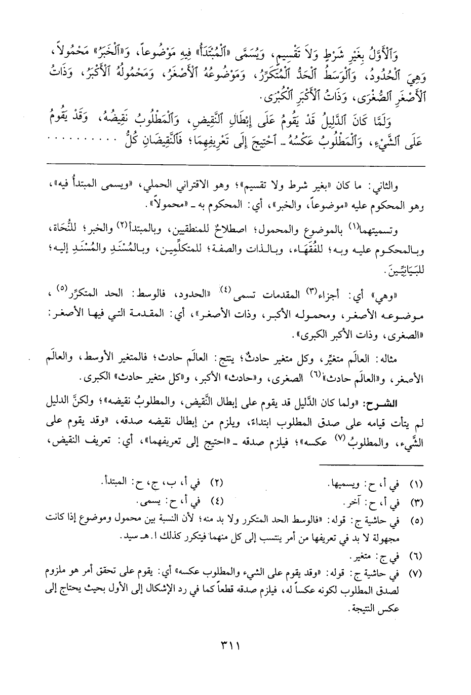 وَالْأول بِغَيْر شَرط وَلَا تَقْسِيم، وَيُسمى " الْمُبْتَدَأ " فِيهِ مَوْضُوعا، و " الْخَبَر " مَحْمُولا، وَهِي الْحُدُود، وَالْوسط الْحَد المتكرر، وموضوعه الْأَصْغَر، ومحموله الْأَكْبَر، وَذَات الْأَصْغَر الصُّغْرَى، وَذَات الْأَكْبَر الْكُبْرَى.