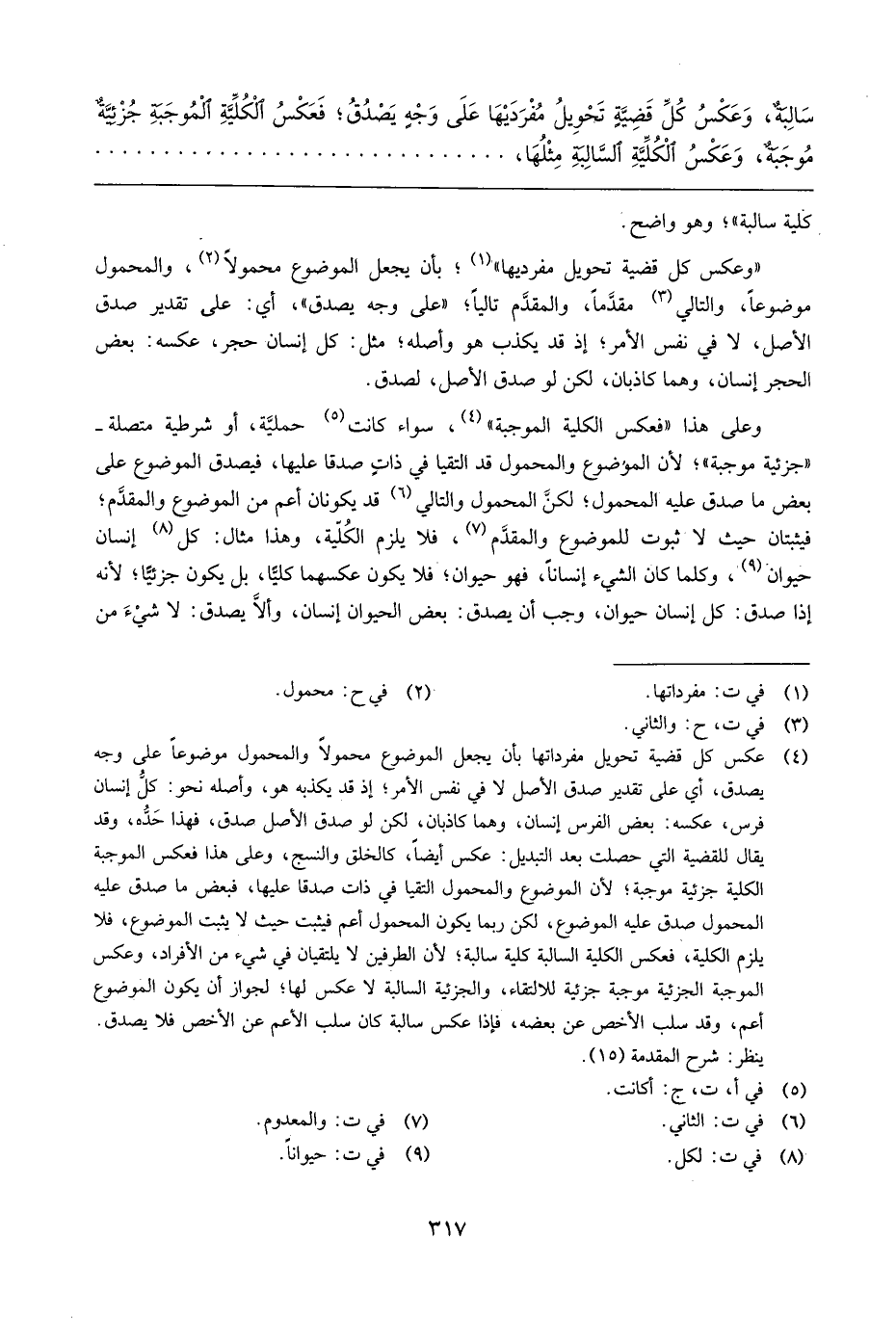 سالبة، وَعكس كل قَضِيَّة تَحْويل مفرديها على وَجه يصدق؛ فعكس الْكُلية الْمُوجبَة جزئية مُوجبَة، وَعكس الْكُلية السالبة مثلهَا، ... ... ... ... ... ... ... ...