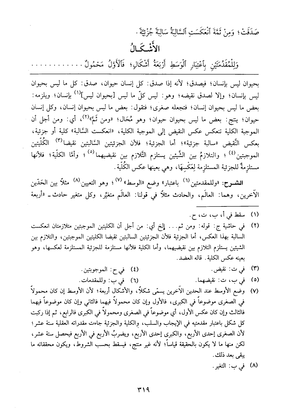 الشَّرْح: " وللمقدمتين بِاعْتِبَار " وضع " الْوسط "؛ وَهُوَ التَّعْيِين مثلا بَين الحدين الآخرين، وهما: الْعَالم، والحادث مثلا فِي قَوْلنَا: الْعَالم متغير، وكل متغير حَادث - " أَرْبَعَة