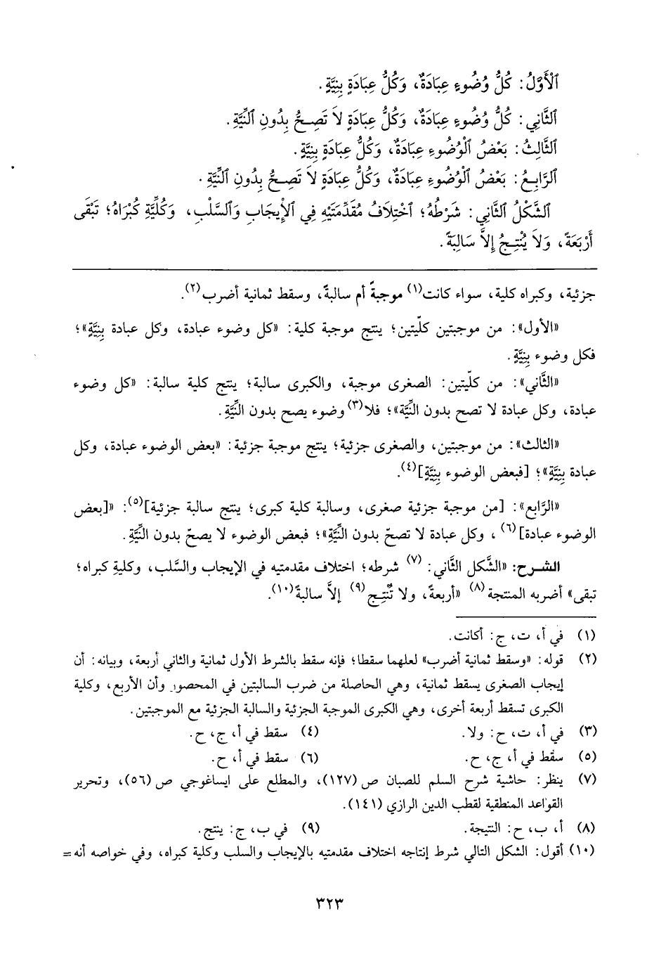 " الثَّانِي ": من كليتين: الصُّغْرَى مُوجبَة، والكبرى سالبة؛ ينْتج كُلية سالبة: " كل وضوء عبَادَة، وكل عبَادَة لَا تصح بِدُونِ النِّيَّة "؛ فَلَا وضوء يَصح بِدُونِ النِّيَّة.