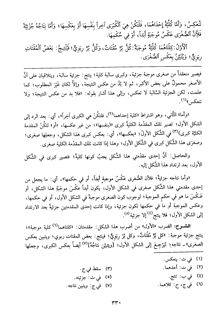 هَامِش فَيصير منعقدا من صغرى مُوجبَة جزئية، وكبرى سالبة كُلية؛ ينْتج: جزئية سالبة، ويتلاقيان على أَن الْأَصْغَر مَحْمُول على بعض الْأَكْبَر، ثمَّ لَا بُد من عكس النتيجة، وَإِلَّا لَكَانَ غير الْمَطْلُوب، كَمَا علمت، لَكِن الْجُزْئِيَّة السالبة لَا تعكس، وَإِلَى هَذَا أَشَارَ بقوله: " فَلَا بُد من عكس النتيجة؛ وَلَا تنعكس ".