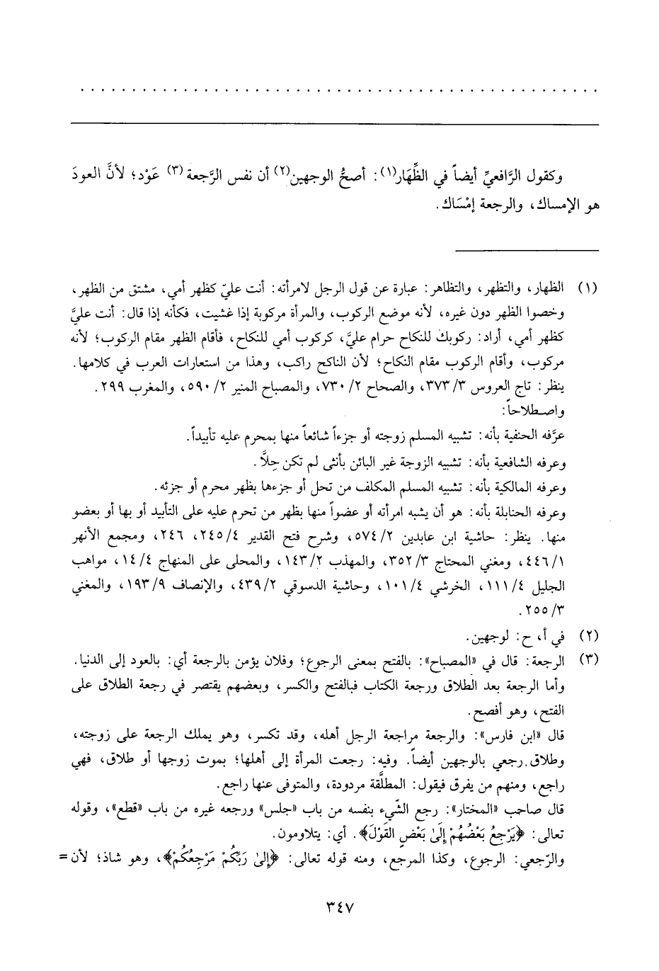 وكقول الرَّافِعِيّ أَيْضا فِي الظِّهَار: أصح الْوَجْهَيْنِ أَن نفس الرّجْعَة عود؛ لِأَن الْعود هُوَ الْإِمْسَاك، وَالرَّجْعَة إمْسَاك.