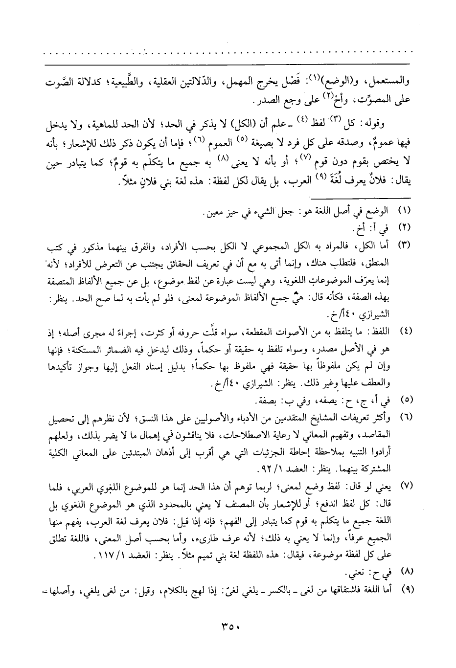 وَقَوله: كل لفظ - علم أَن (الْكل) لَا يذكر فِي الْحَد؛ لِأَن الْحَد للماهية، وَلَا يدْخل فِيهَا عُمُوم، وَصدقه على كل فَرد لَا بِصِيغَة الْعُمُوم؛ فإمَّا أَن يكون ذكر ذَلِك للإشعار؛ بِأَنَّهُ لَا يخْتَص بِقوم دون قوم؛ أَو بِأَنَّهُ لَا يعْنى بِهِ جَمِيع مَا يتَكَلَّم بِهِ قوم؛ كَمَا يتَبَادَر حِين يُقَال: فلَان يعرف لُغَة الْعَرَب، بل يُقَال لكل لَفْظَة: هَذِه لُغَة بني فلَان مثلا.