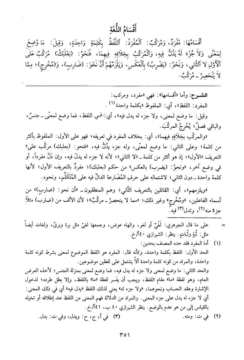 أقسامها: مُفْرد، ومركب: الْمُفْرد: اللَّفْظ بِكَلِمَة وَاحِدَة، وَقيل: مَا وضع لِمَعْنى وَلَا جُزْء لَهُ يدل فِيهِ، والمركب بِخِلَافِهِ فيهمَا، فنحو: (بعلبك) مركب على الأول لَا الثَّانِي، وَنَحْو: (يضْرب) بِالْعَكْسِ، ويلزمهم أَن نَحْو: (ضَارب) ، و (مخرج) ؛ مِمَّا لَا ينْحَصر - مركب.