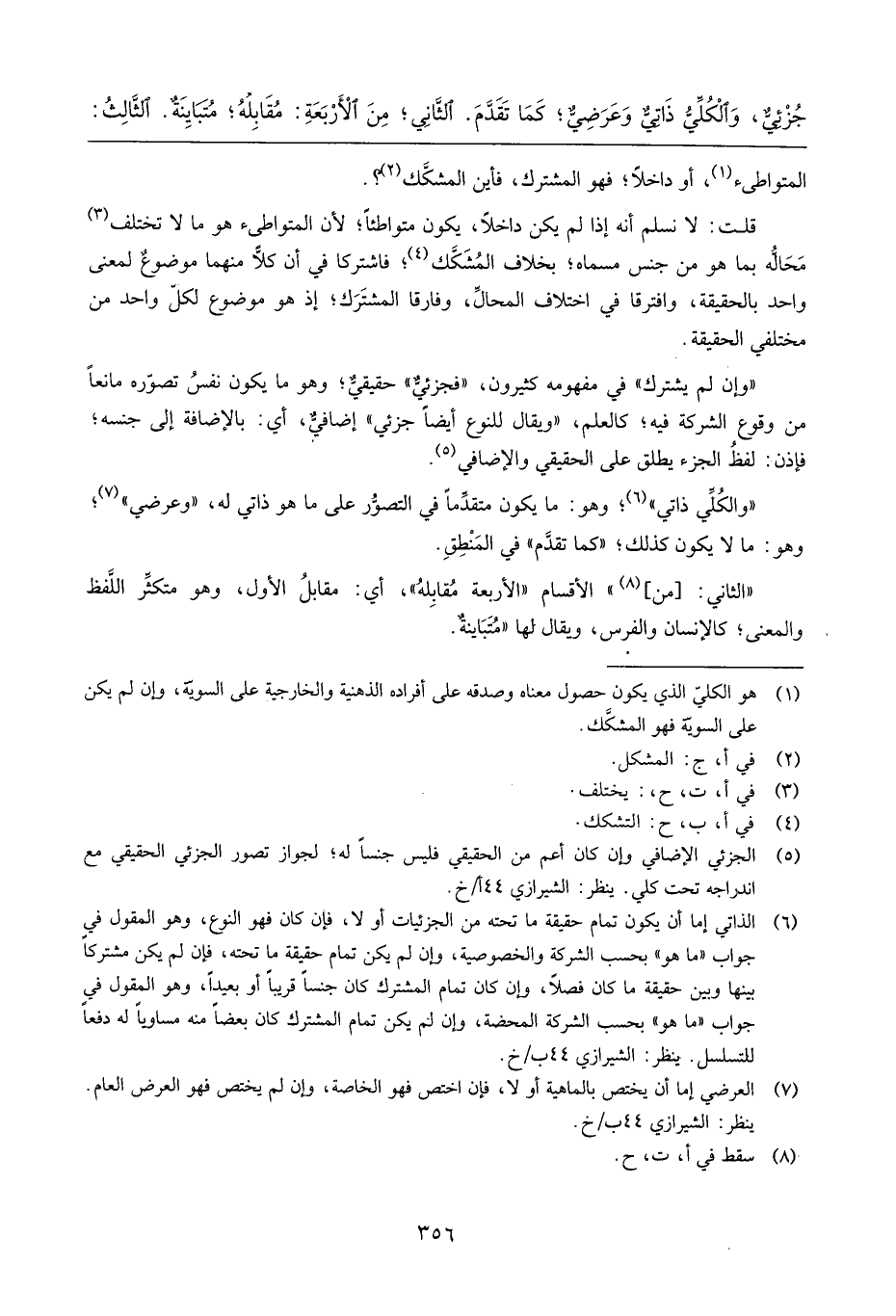قلت: لَا نسلم أَنه إِذا لم يكن دَاخِلا، يكون متواطئا؛ لِأَن المتواطئ هُوَ مَا لَا تخْتَلف محاله بِمَا هُوَ من جنس مُسَمَّاهُ؛ بِخِلَاف المشكك؛ فاشتركا فِي أَن كلا مِنْهُمَا مَوْضُوع لِمَعْنى وَاحِد بِالْحَقِيقَةِ، وافترقا فِي اخْتِلَاف الْمحَال، وفارقا الْمُشْتَرك؛ إِذْ هُوَ مَوْضُوع لكل وَاحِد من مختلفي الْحَقِيقَة.