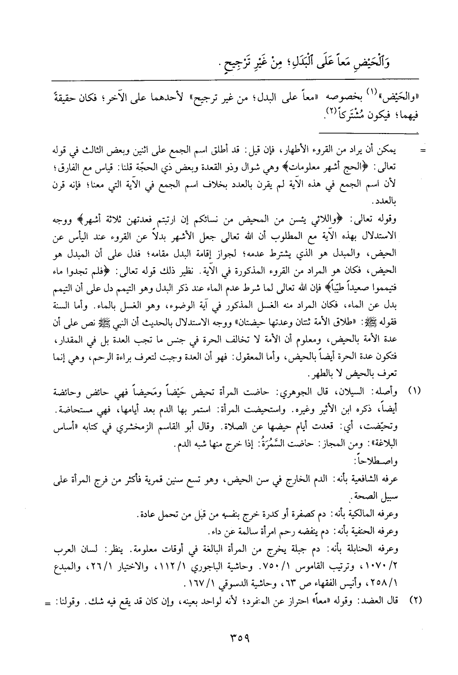 هَامِش " وَالْحيض " بِخُصُوصِهِ " مَعًا على الْبَدَل؛ من غير تَرْجِيح " لأَحَدهمَا على الآخر؛ فَكَانَ حَقِيقَة فيهمَا؛ فَيكون مُشْتَركا.