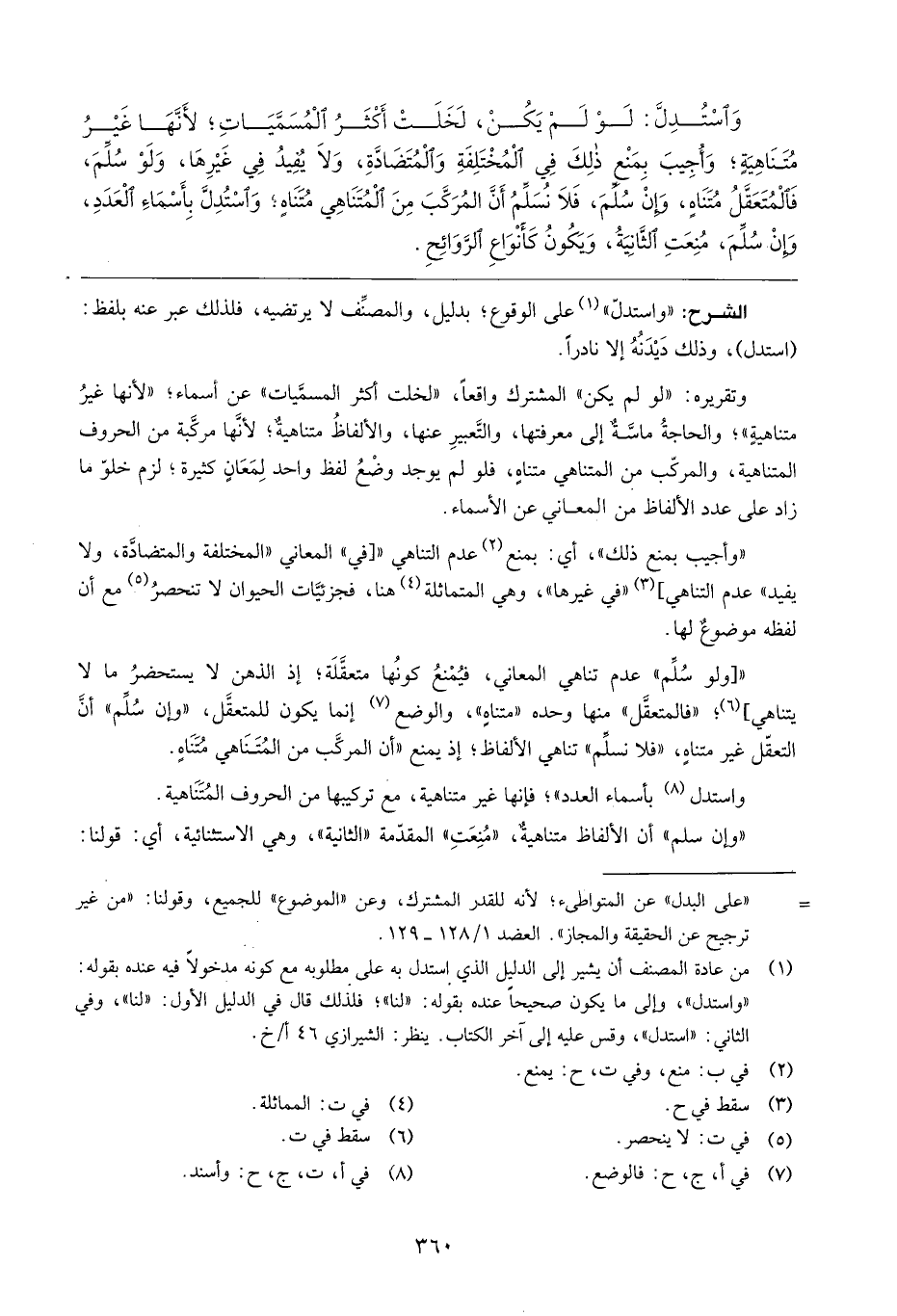 وَاسْتدلَّ: لَو لم يكن، لخلت أَكثر المسميات؛ لِأَنَّهَا غير متناهية؛ وَأجِيب بِمَنْع ذَلِك فِي الْمُخْتَلفَة والمتضادة، وَلَا يُفِيد فِي غَيرهَا، وَلَو سلم، فالمتعقل متناه، وَإِن سلم، فَلَا نسلم أَن الْمركب من المتناهي متناه؛ وَاسْتدلَّ بأسماء الْعدَد، وَإِن سلم، منعت الثَّانِيَة، وَيكون كأنواع الروائح.