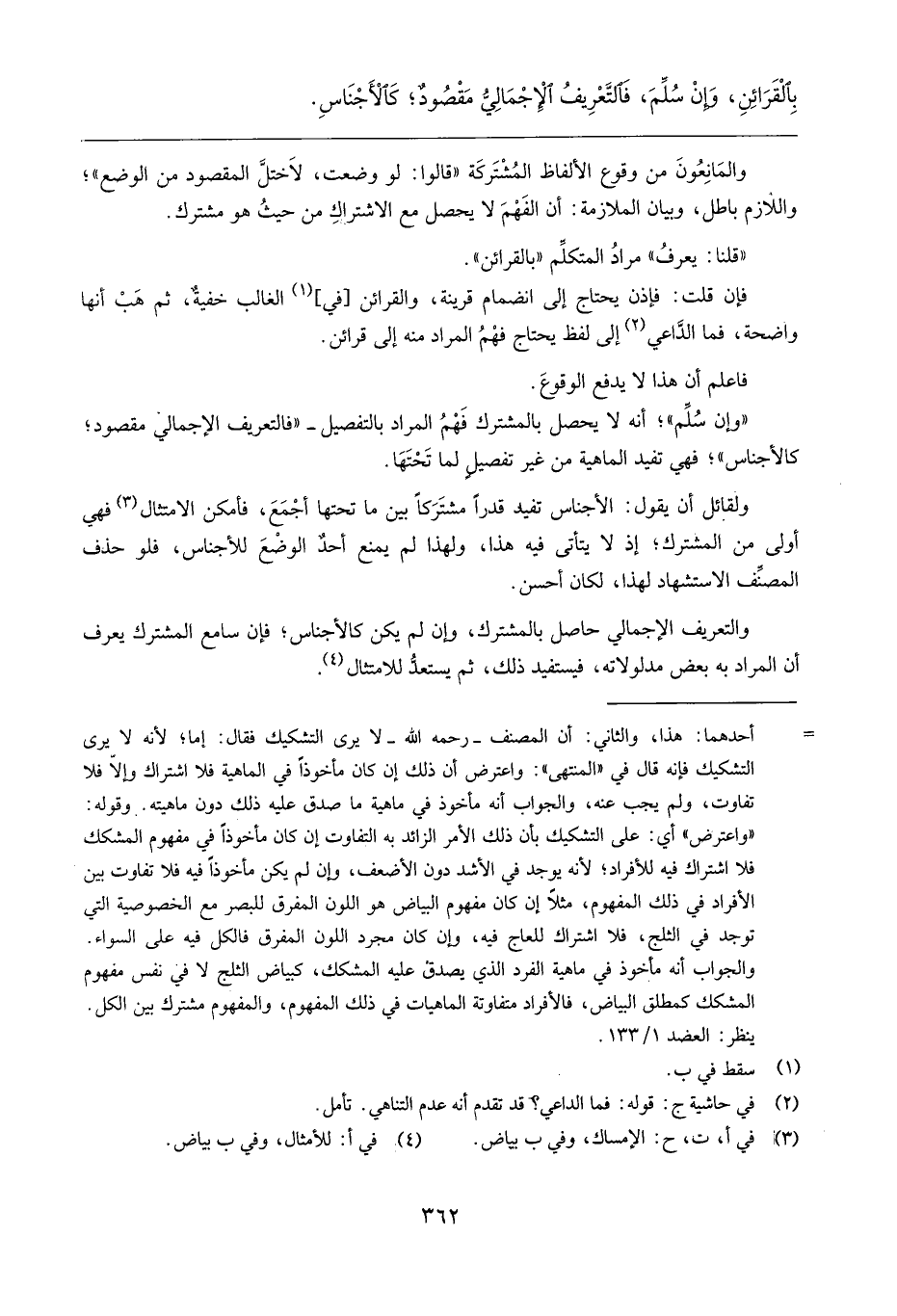 والتعريف الإجمالي حَاصِل بالمشترك، وَإِن لم يكن كالأجناس؛ فَإِن سامع الْمُشْتَرك يعرف أَن المُرَاد بِهِ بعض مدلولاته، فيستفيد ذَلِك، ثمَّ يستعد للامتثال.