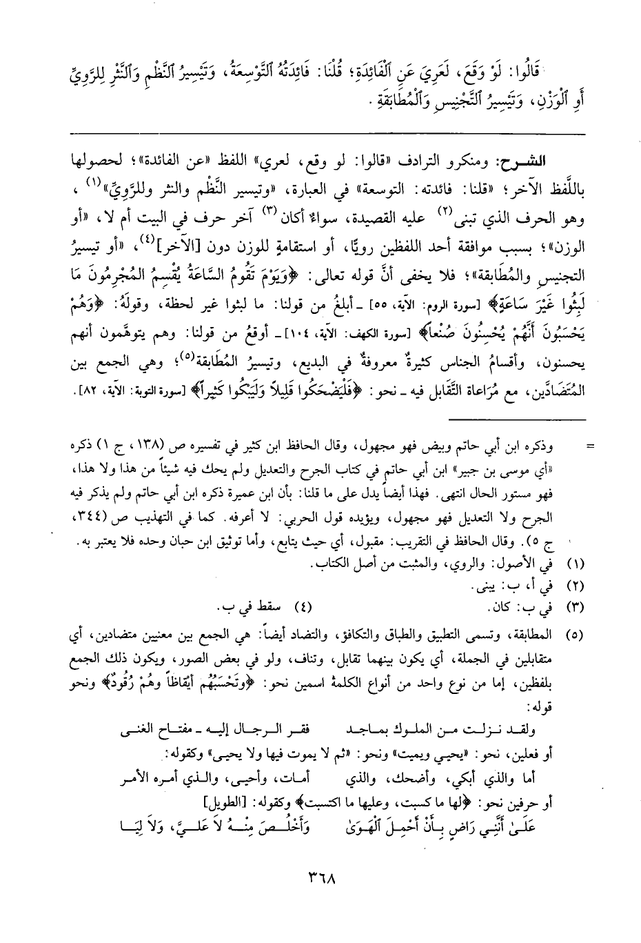 الشَّرْح: " ومنكرو الترادف " قَالُوا: لَو وَقع، لعري " اللَّفْظ " عَن الْفَائِدَة "؛ لحصولها بِاللَّفْظِ الآخر؛ " قُلْنَا: فَائِدَته: التَّوسعَة " فِي الْعبارَة، " وتيسير النّظم والنثر وللروي "، وَهُوَ الْحَرْف الَّذِي تبنى عَلَيْهِ القصيدة، سَوَاء أَكَانَ آخر حرف فِي الْبَيْت أم لَا، " أَو الْوَزْن "؛ بِسَبَب مُوَافقَة أحد اللَّفْظَيْنِ رويا، أَو استقامة للوزن دون [الآخر] ، " أَو تيسير التَّجْنِيس والمطابقة "؛ فَلَا يخفى أَن قَوْله تَعَالَى: {وَيَوْم تقوم السَّاعَة يقسم المجرمون مَا لَبِثُوا غير سَاعَة} [سُورَة الرّوم: الْآيَة، 55]- أبلغ من قَوْلنَا: مَا لَبِثُوا غير لَحْظَة، وَقَوله: {وهم يحسبون أَنهم يحسنون صنعا} [سُورَة الْكَهْف: الْآيَة، 104]- أوقع من قَوْلنَا: وهم يتوهمون أَنهم يحسنون، وأقسام الجناس كَثِيرَة مَعْرُوفَة فِي البديع، وتيسير الْمُطَابقَة؛ وَهِي الْجمع بَين المتضادين، مَعَ مُرَاعَاة التقابل فِيهِ - نَحْو: {فليضحكوا قَلِيلا وليبكوا كثيرا} [سُورَة التَّوْبَة: الْآيَة، 82] .