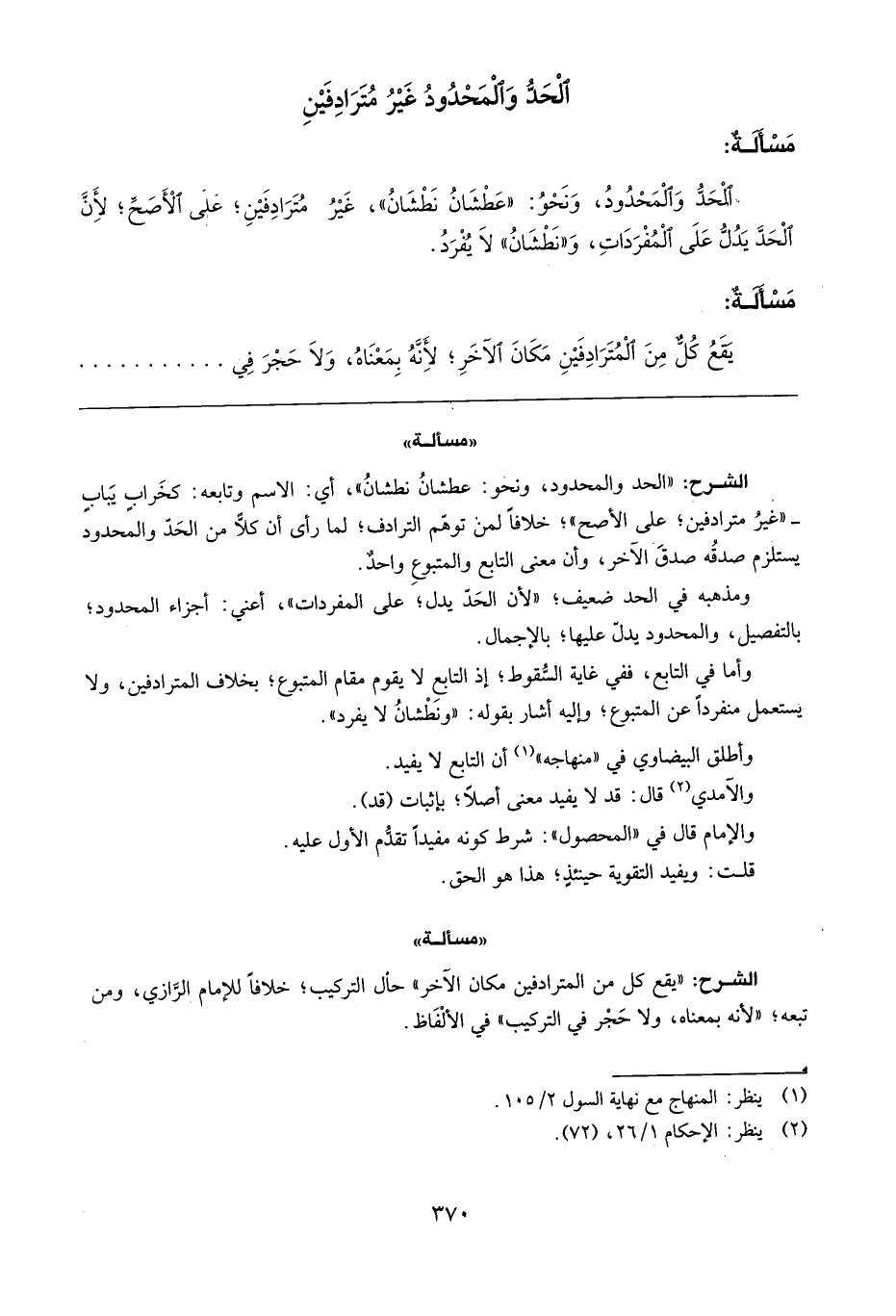 الشَّرْح: " الْحَد والمحدود، وَنَحْو: عطشان نطشان "، أَي: الِاسْم وَتَابعه: كخراب يباب - " غير مترادفين؛ على الْأَصَح "؛ خلافًا لمن توهم الترادف؛ لما رأى أَن كلا من الْحَد والمحدود يسْتَلْزم صدقه صدق الآخر، وَأَن معنى التَّابِع والمتبوع وَاحِد.