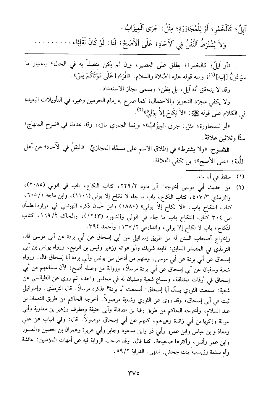 الشَّرْح: " وَلَا يشْتَرط " فِي إِطْلَاق الِاسْم على مُسَمَّاهُ الْمجَازِي - " النَّقْل فِي الْآحَاد " عَن أهل اللُّغَة؛ " على الْأَصَح "؛ بل تَكْفِي العلاقة.