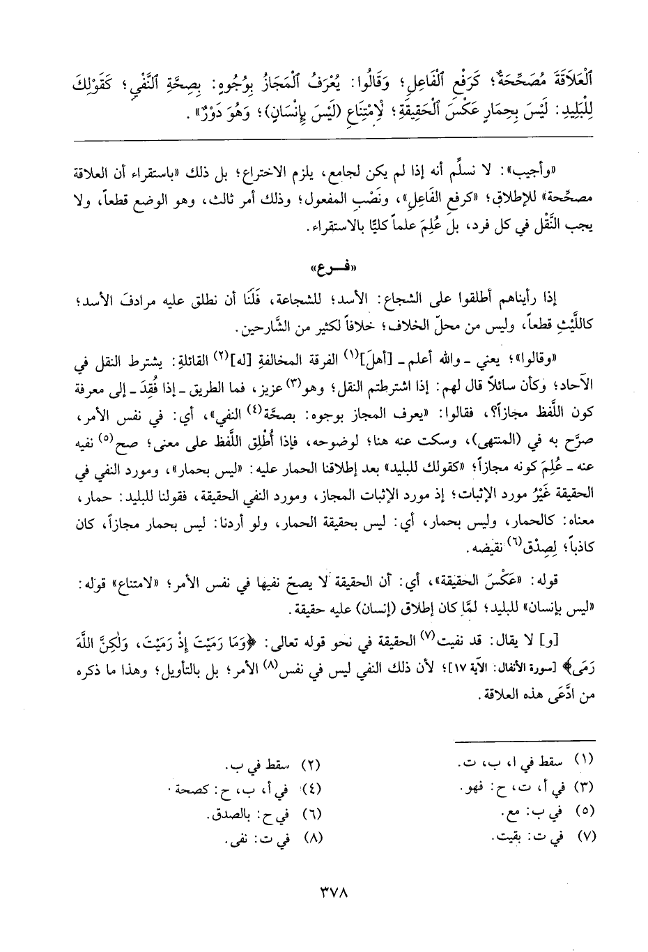 [و] لَا يُقَال: قد نفيت الْحَقِيقَة فِي نَحْو قَوْله تَعَالَى: {وَمَا رميت إِذْ رميت، وَلَكِن الله رمى} [سُورَة الْأَنْفَال: الْآيَة 17] ؛ لِأَن ذَلِك النَّفْي لَيْسَ فِي نفس الْأَمر؛ بل بالتأويل؛ وَهَذَا مَا ذكره من ادّعى هَذِه العلاقة.