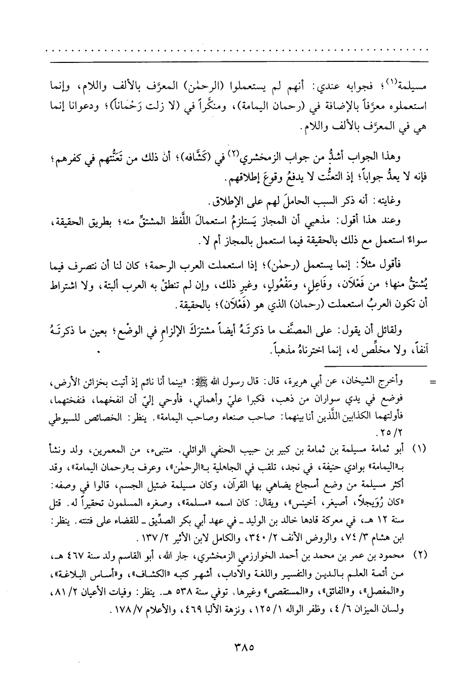 هَامِش مُسَيْلمَة؛ فَجَوَابه عِنْدِي: أَنهم لم يستعملوا (الرَّحْمَن) الْمُعَرّف بِالْألف وَاللَّام، وَإِنَّمَا استعملوه مُعَرفا بِالْإِضَافَة فِي (رحمان الْيَمَامَة) ، ومنكرا فِي (لَا زلت رحمانا) ؛ ودعوانا إِنَّمَا هِيَ فِي الْمُعَرّف بِالْألف وَاللَّام.