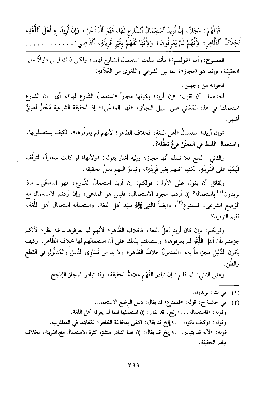 أَحدهمَا: أَن نقُول: " إِن أُرِيد " بِكَوْنِهَا مجَازًا " اسْتِعْمَال الشَّارِع لَهَا "، أَي: أَن الشَّارِع استعملها فِي هَذِه الْمعَانِي على سَبِيل التَّجَوُّز، " فَهُوَ الْمُدعى "؛ إِذْ الْحَقِيقَة الشَّرْعِيَّة مجَاز لغَوِيّ أشهر.